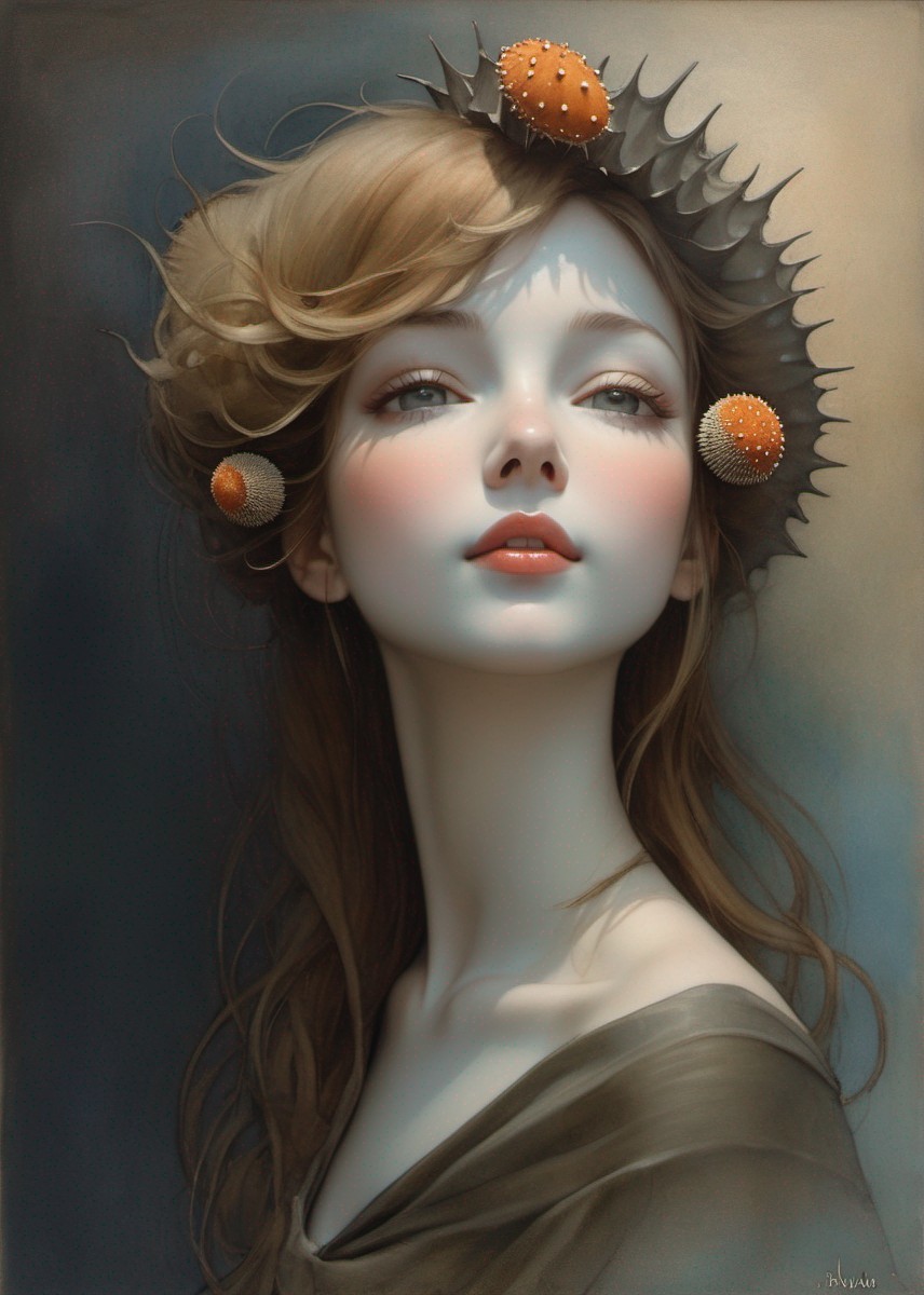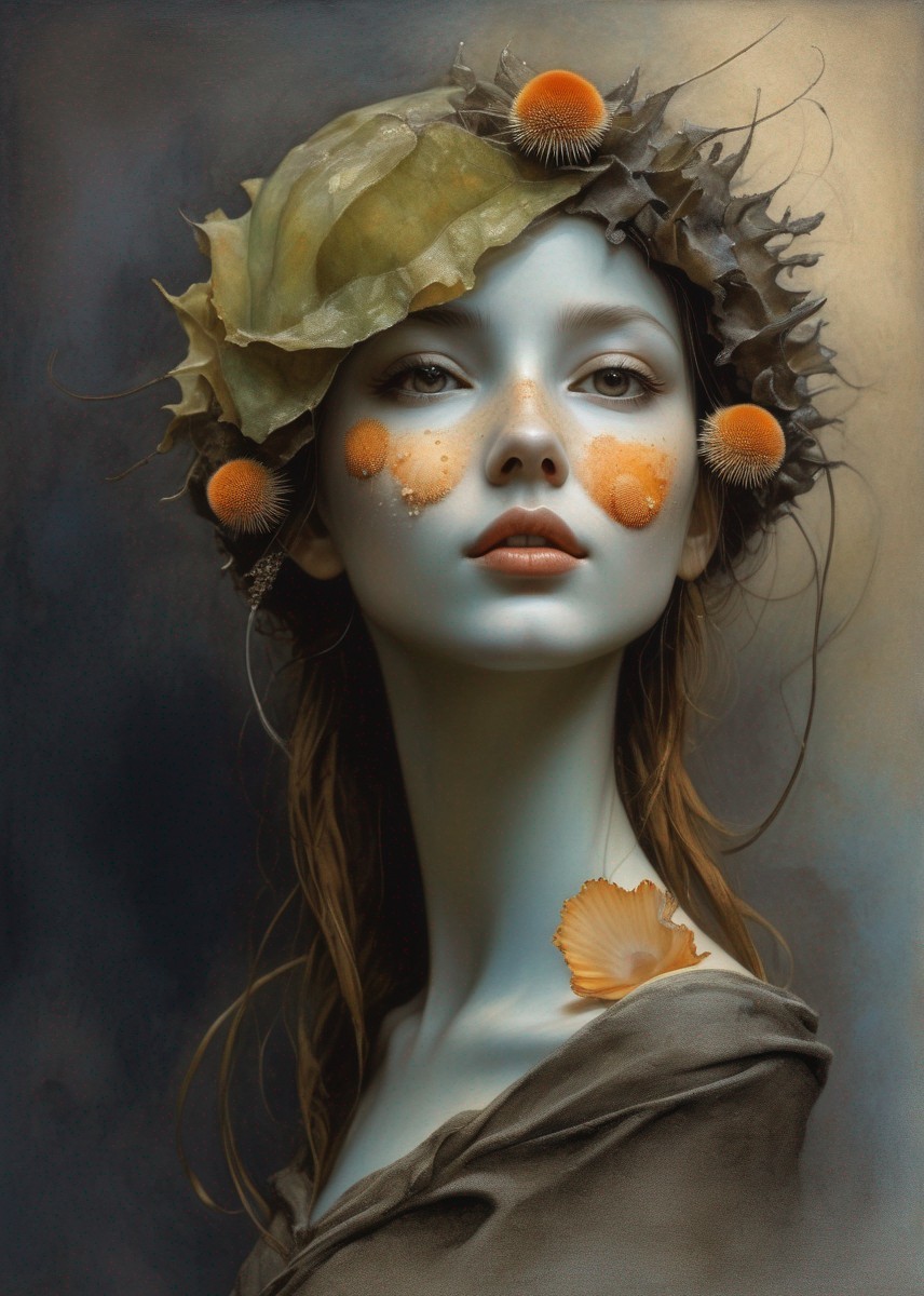 A portrait of a woman with striking eyes, adorned with a unique crown of thorns and chestnut burrs, exuding an otherworldly beauty.