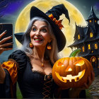 Witch with Pumpkin Selfie in Spooky Halloween Setting