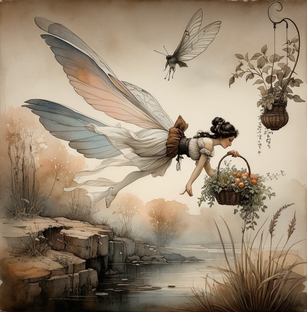 . Gypsy lady collecting herbs in basket , colored ink drawing, watercolor artwork on old withered paper, vintage, by Caravaggio, Fragonard, Anton Pieck, pale colors, high detail, intricately detailed, hyperdetailed volumetric lighting, art nouveau graphic steampunk ., whimsical, beautiful, poignant, touching. colors blush bronze, black. soft watercolor extra water in magical realism by Annigoni, Egon Schiele, Milo Manara, Botticelli, Catrin Welz-Stein, Jean Metzinger, Klimt, perfect eyes, perfect handsface, highly detailed, complementary colors, hyper detailed. Watercolor and ink splatter, dynamic pose, dark blue background, unreal engine, alphonse mucha, global illumination, detailed and intricate environment Beautiful woman in the style of Pino Daeni Dorota Piotrowiak Edward Gorey, junji ito, klimnt , gold leaf color, silver leaf color beautiful dynamic lighting high definition hdr * Random prompt award winning Max Ernst ultra detailed 4K 3D Texture