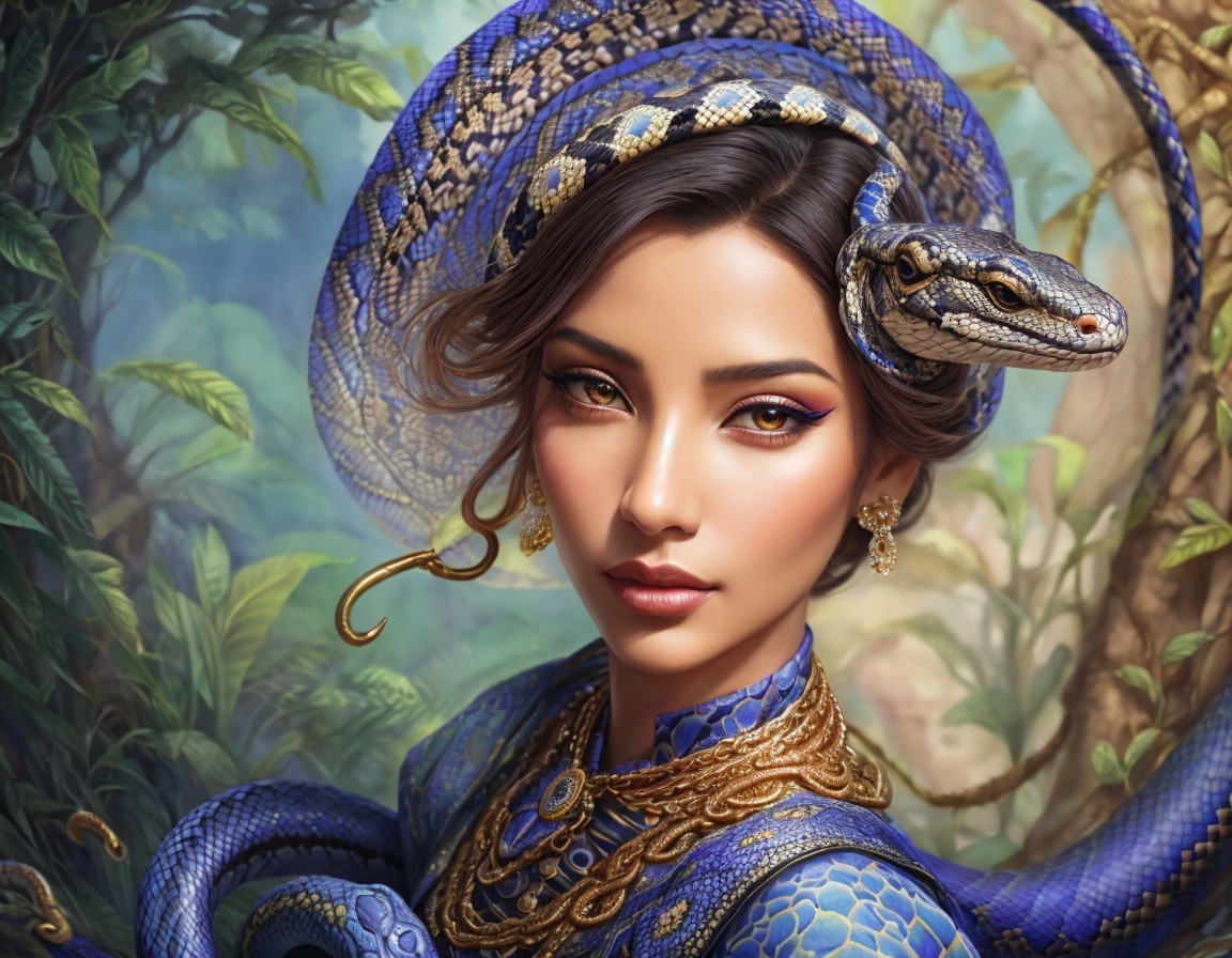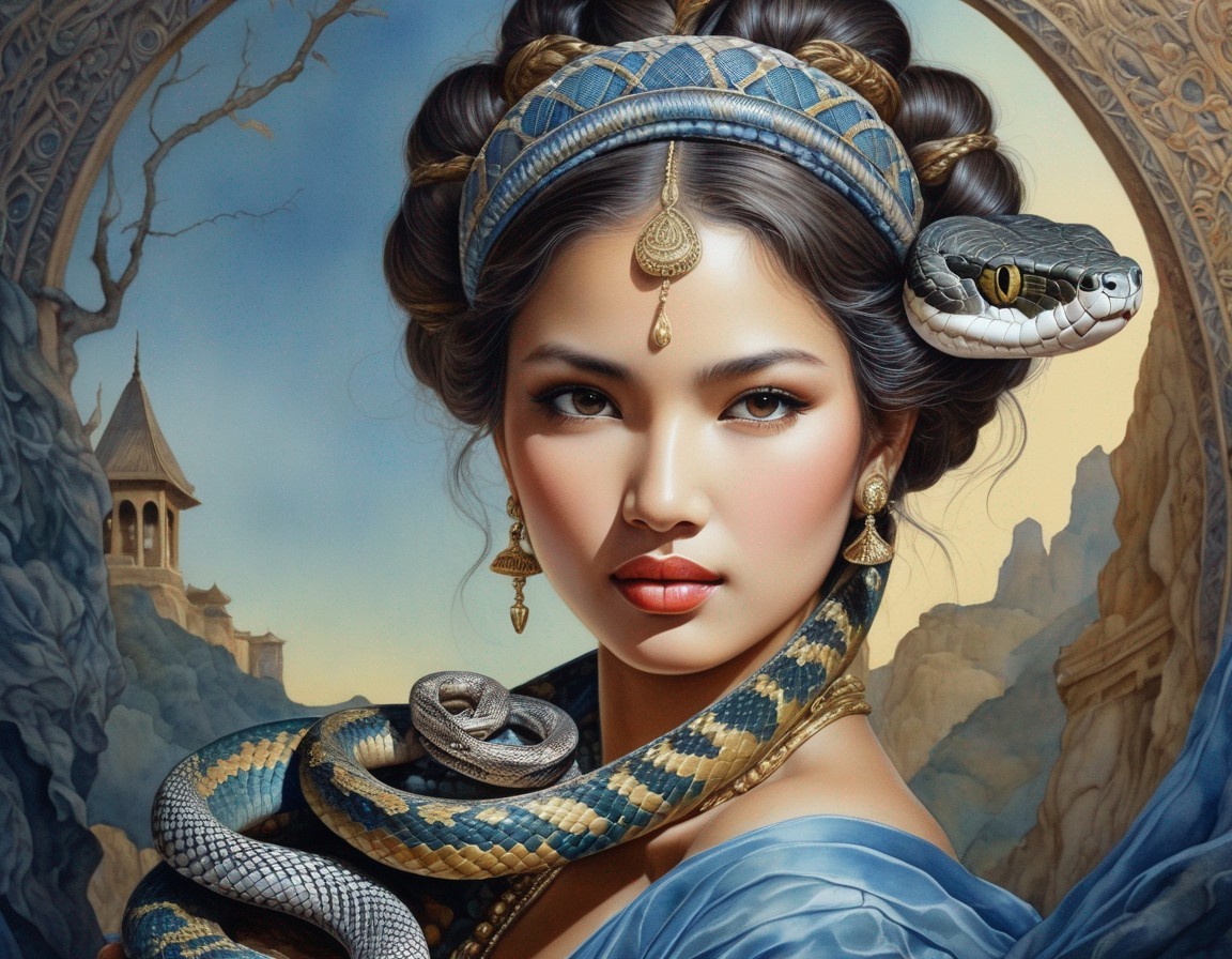 A woman in blue attire sits in a basket beside a river with a large snake coiled around her, amidst a rocky landscape.