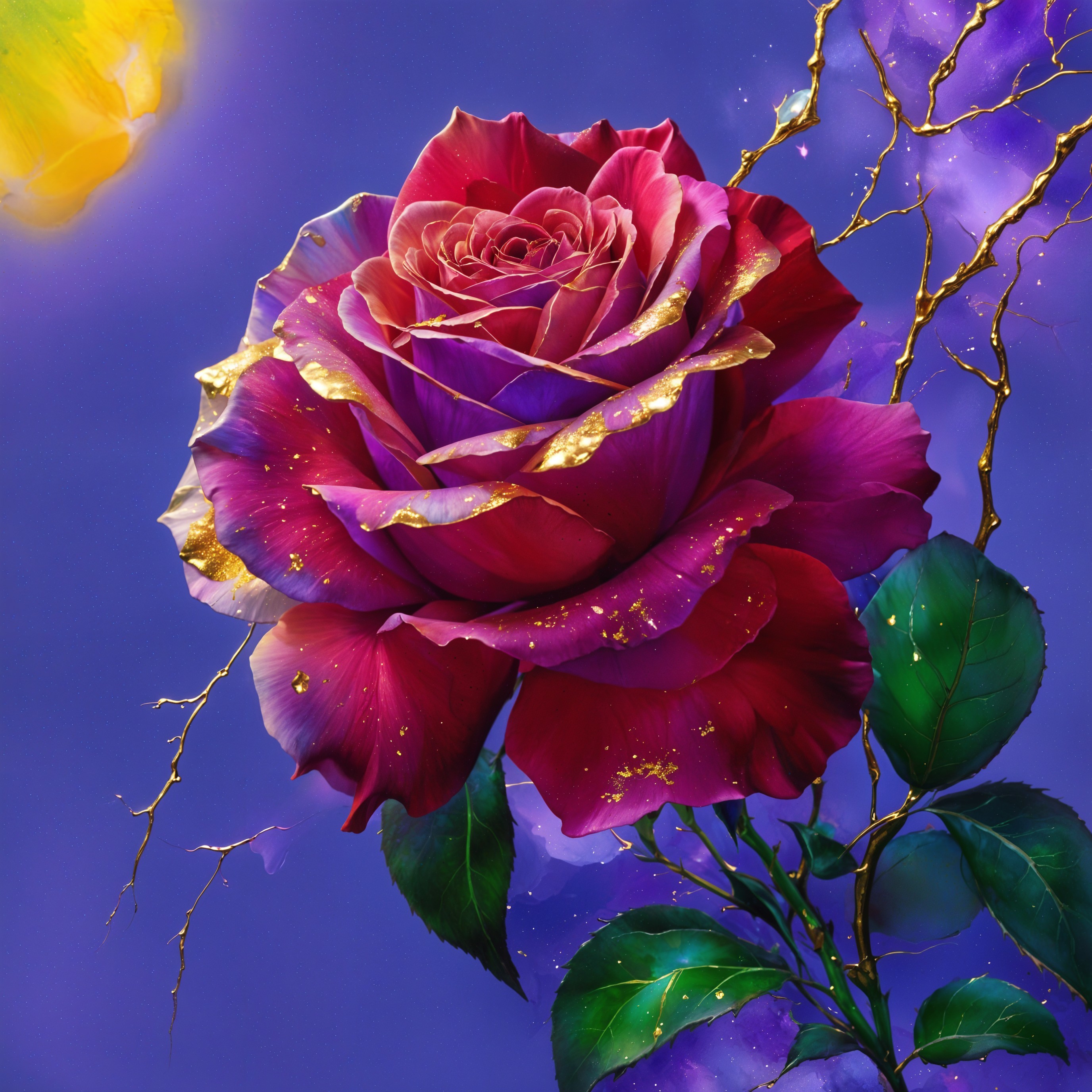 A vivid, deep red rose with gold accents stands against a colorful stained glass background of purples and blues, capturing a blend of elegance and intricate beauty.