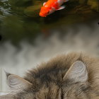 A fluffy cat rests on the water's surface, eyes closed in tranquility. Above, a vibrant orange koi fish swims, creating gentle ripples in the calm water, adding a whimsical touch to the serene scene.