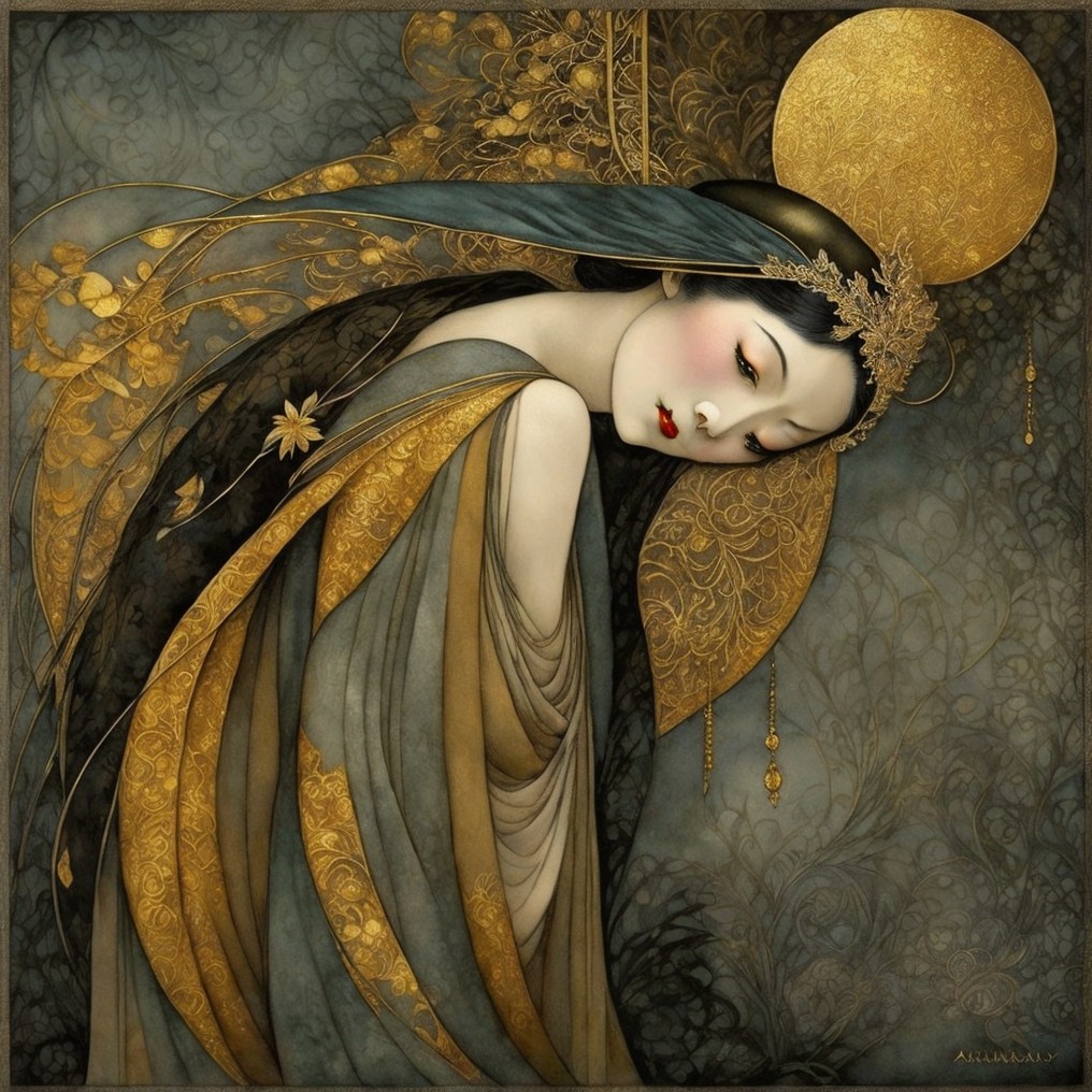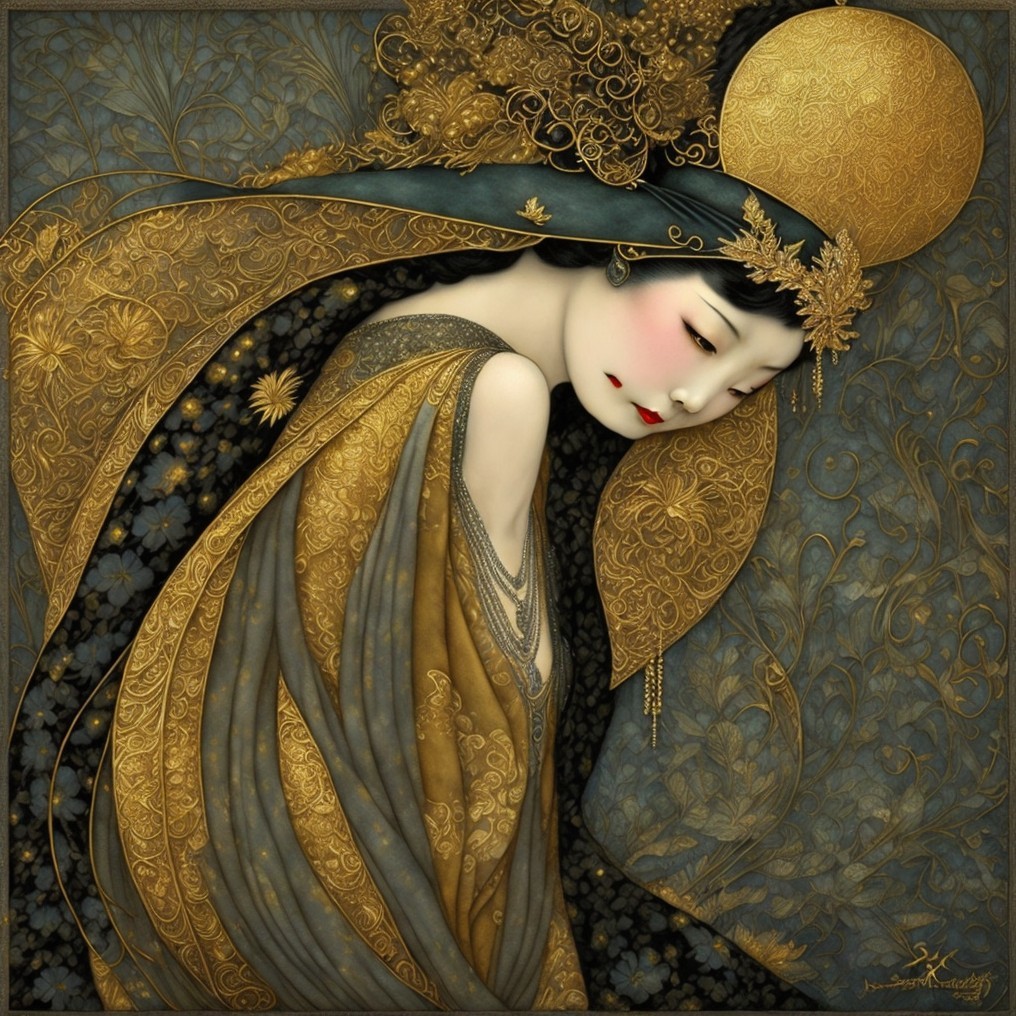 + Prompt:Beautiful woman, flapper, roaring 20s, great gatsby Medieval Japanese Artists Sumi-e Style, Velvet Black, Velvet Indigo, Shabby, Dull Gold, Amber Gray, Golden Ratio, Surreal Fantasy, Elegant, High Definition Ultra Fine 3D Line, Zenangle Style, Watercolor Patchwork , Arthur Rackham Style, Paul Kidby, Gediminas Prankevicius, Jacek Jerka, Extremely Detailed, Intricate, Thoughtful, HDR, Fractal, Beautiful, Award Winning, Fantasy Look, Fantasy, Crisp Quality