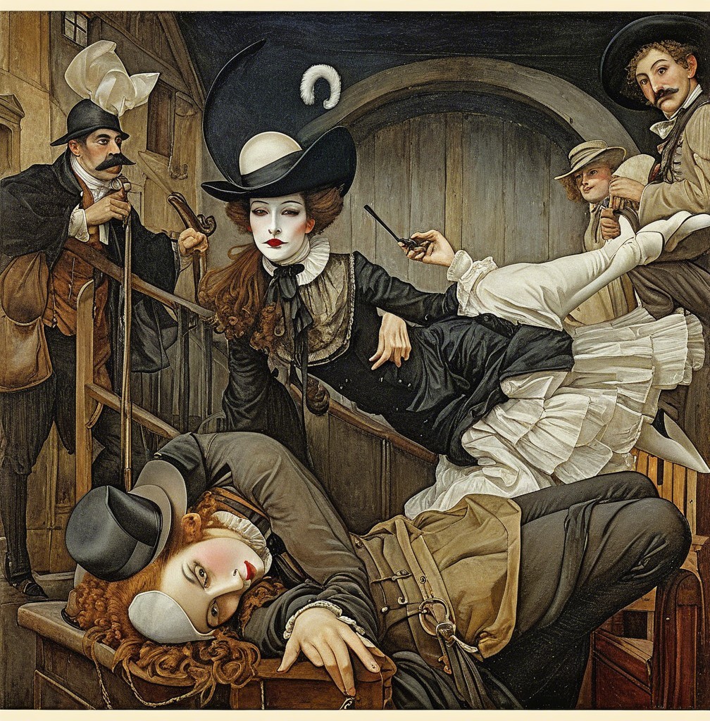 The image depicts three figures in theatrical attire: a male figure in a top hat beside a seated woman in a white hat, both with painted faces, while another man stands in the background.