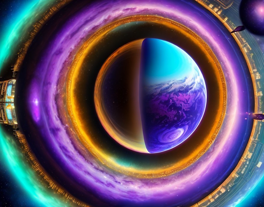A vibrant space scene with a large, swirling blue planet surrounded by vivid, multicolored concentric rings against a starry backdrop.