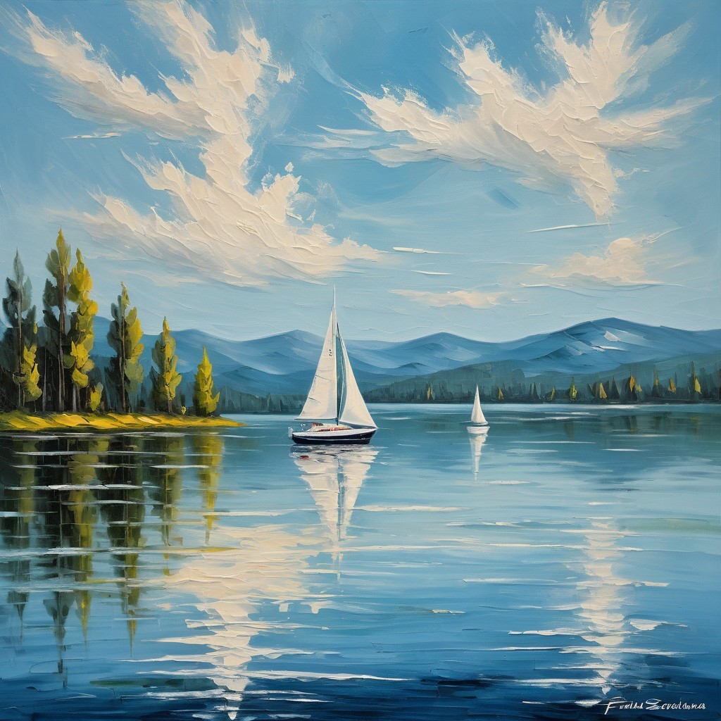 A serene landscape featuring a calm lake reflecting blue skies and fluffy clouds. A sailboat glides smoothly, surrounded by lush trees and distant mountains, creating a peaceful scene. Prompt by Farcloud. Thanks!