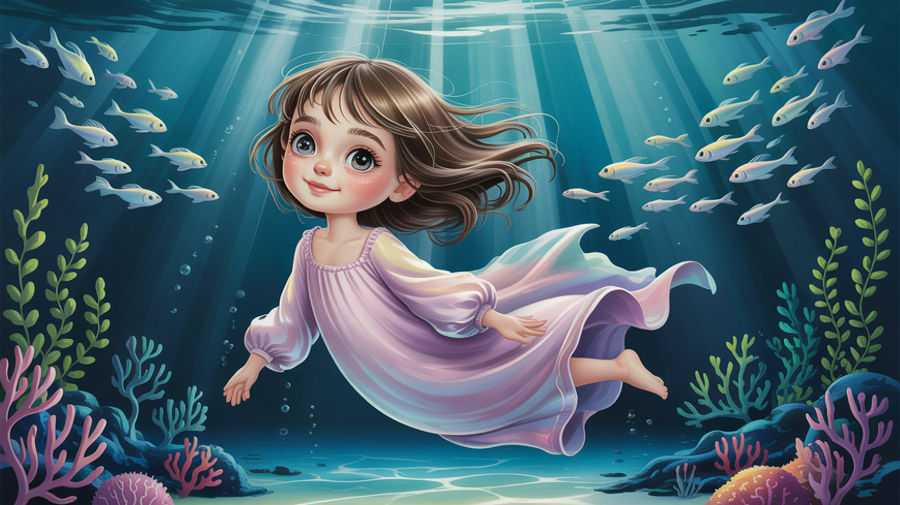 A charming scene unfolds as a girl in a cute tan nightgown gracefully swims underwater, surrounded by vibrant marine life, her joyful expression reflecting the serene beauty of the ocean.