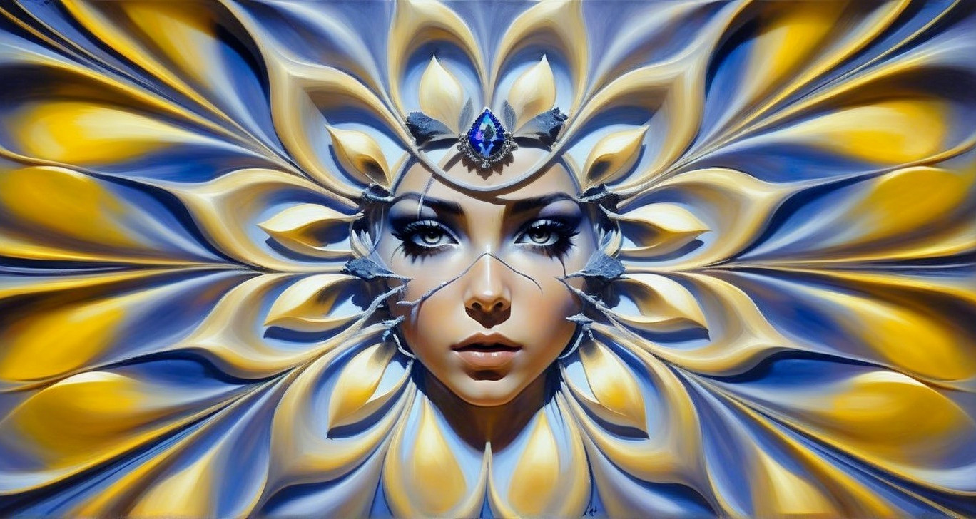 Prompt: portrait, girl's face in the center of a giant flower, impasto oil painting, dark, abstract, ominous, style of Dave McKean, Christopher Bucklow, Stephen Gammell and Jeremy Mann