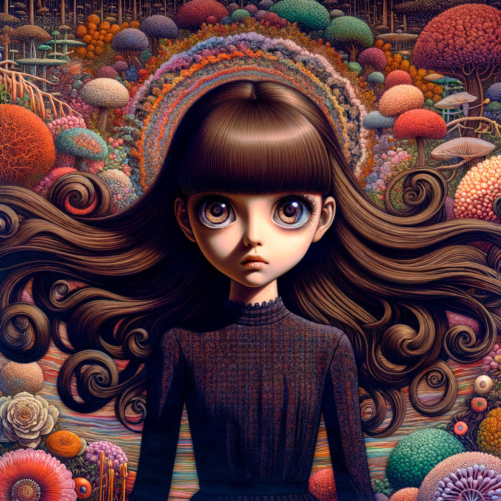 Prompt: brown haired young woman with bangs floating in the air, posessed eyes, big eyelashes, wearing a black tight dress, colorful nature in background,