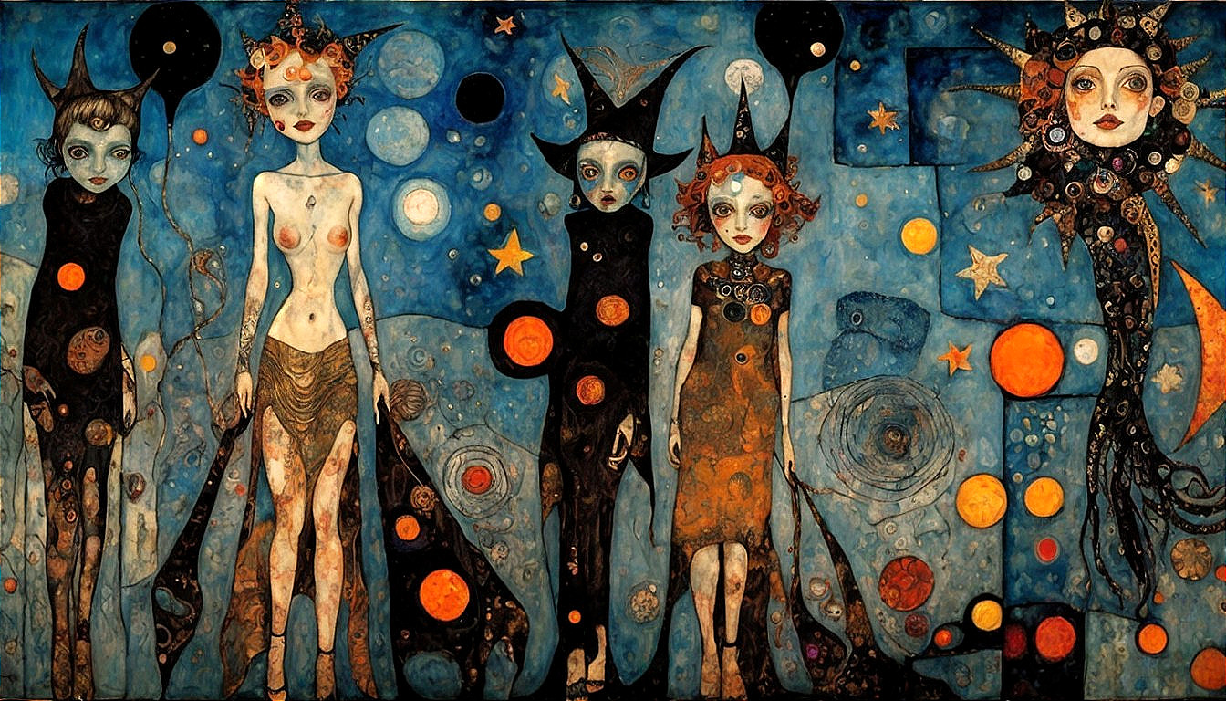Prompt: mixed media modern art, beautiful witches with dress filled with stars, blue textured fleshy tentacles with large teeth, by Egon Schiele, Paul Klee and Dave McKean, mixed media, metallic inks by Gustav Klimt . Cute Cenobite beauty witch with demonic features, horror inspired. rusted metal suits with leather, halos, thick acryllic paint details, Van Gogh fine art Marc Chagall, Amedeo Modigliani, Enki Bilal, demon eye in the sky, Horror themed, Stephen Gammell ,Rosina Wachtmeister cosmic, intricate photorealistic ,high detail colourful