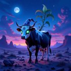 A mysterious figure in a cloak stands atop a hill, stirring a glowing cauldron. An ethereal entity emerges with bubbles, while a goat-like creature stands beside, set against a magical twilight landscape.