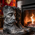 A bronze bust of a man with a flowing cloak rests near a fireplace, where warm flames flicker. The textured surface highlights intricate details of the face, set against a rustic backdrop.