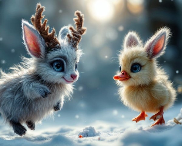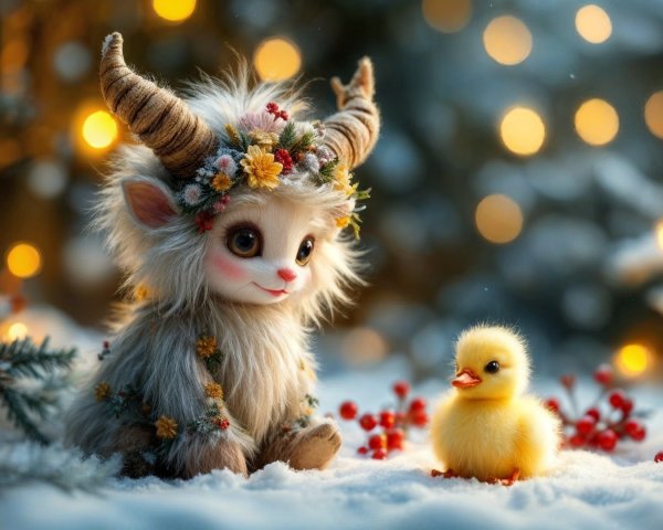 A whimsical scene featuring a badger in a shiny golden coat and a large hat, standing on a beach next to a cute yellow duckling, with a sailboat in the background and seashells scattered around.