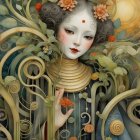 A serene woman with long, flowing hair is framed by autumn leaves and a golden full moon. Delicate spider webs weave around her, enhancing the ethereal and mystical atmosphere.