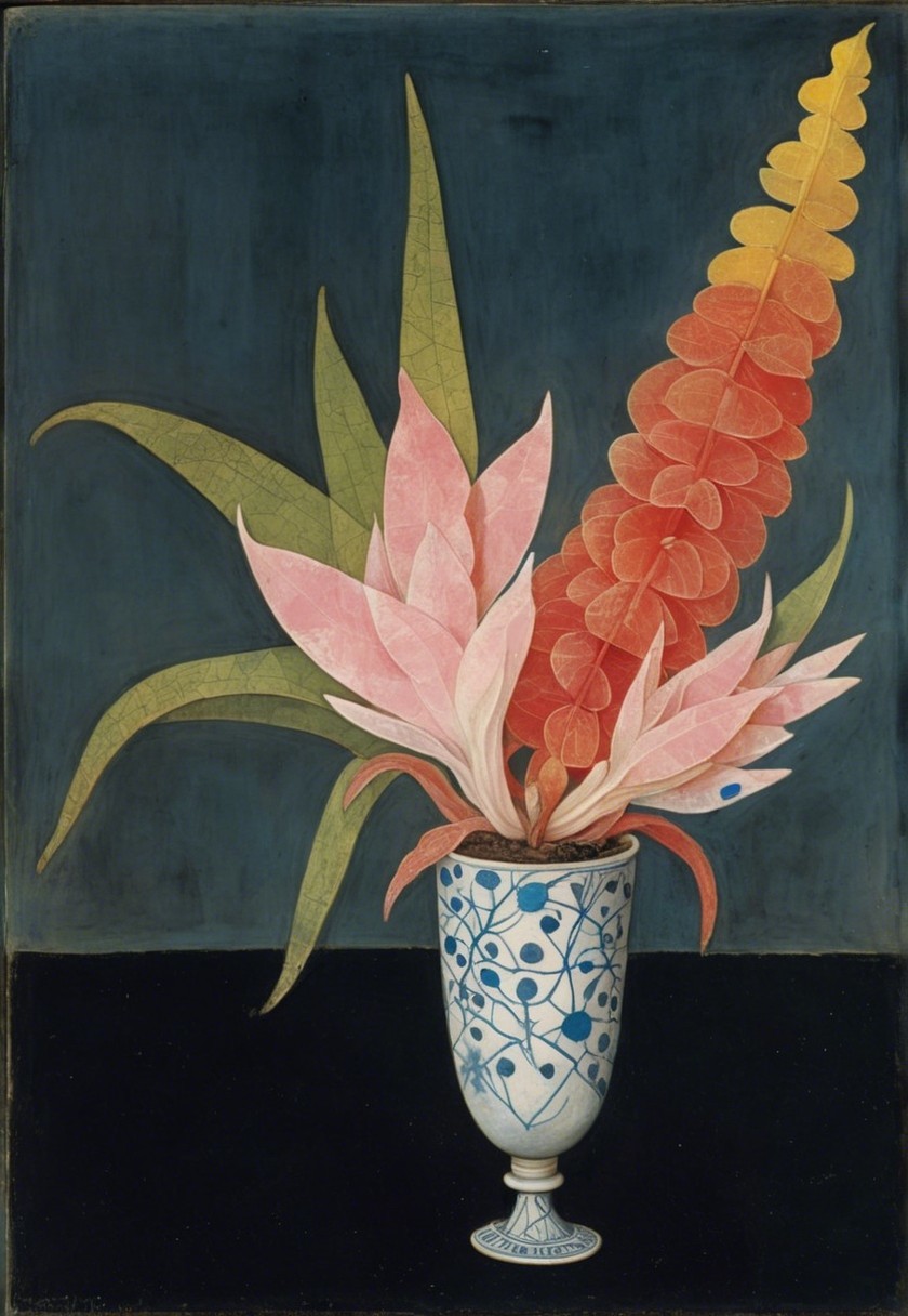 A still-life painting features a vase with vibrant pink and yellow leaves. Tall, fluffy red flowers rise prominently, set against a dark background, creating a striking contrast.