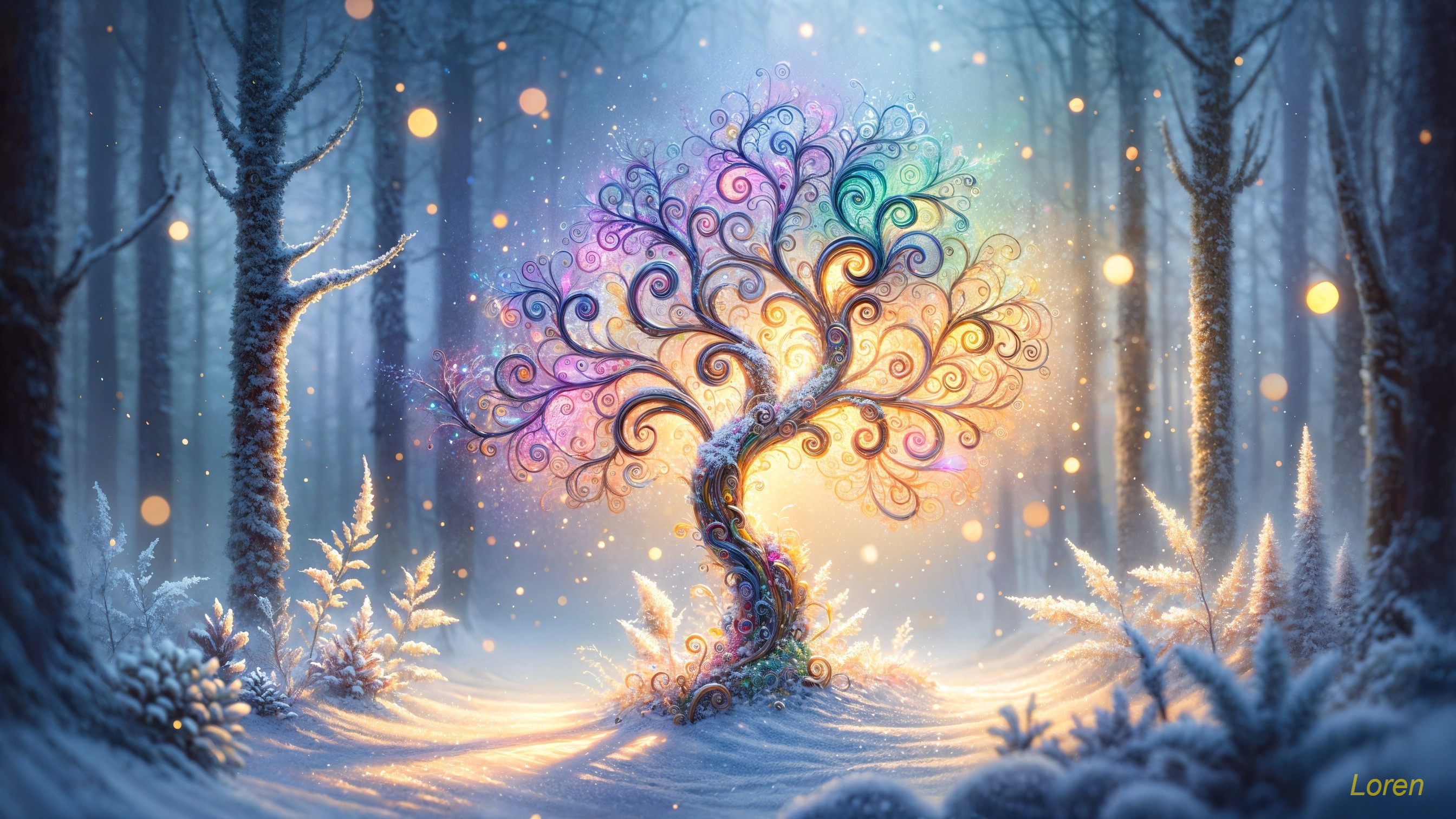 A vibrant, swirling tree stands in a snowy forest, illuminated by a rainbow glow. Soft snowflakes drift around, creating a magical, serene winter scene bathed in gentle light.