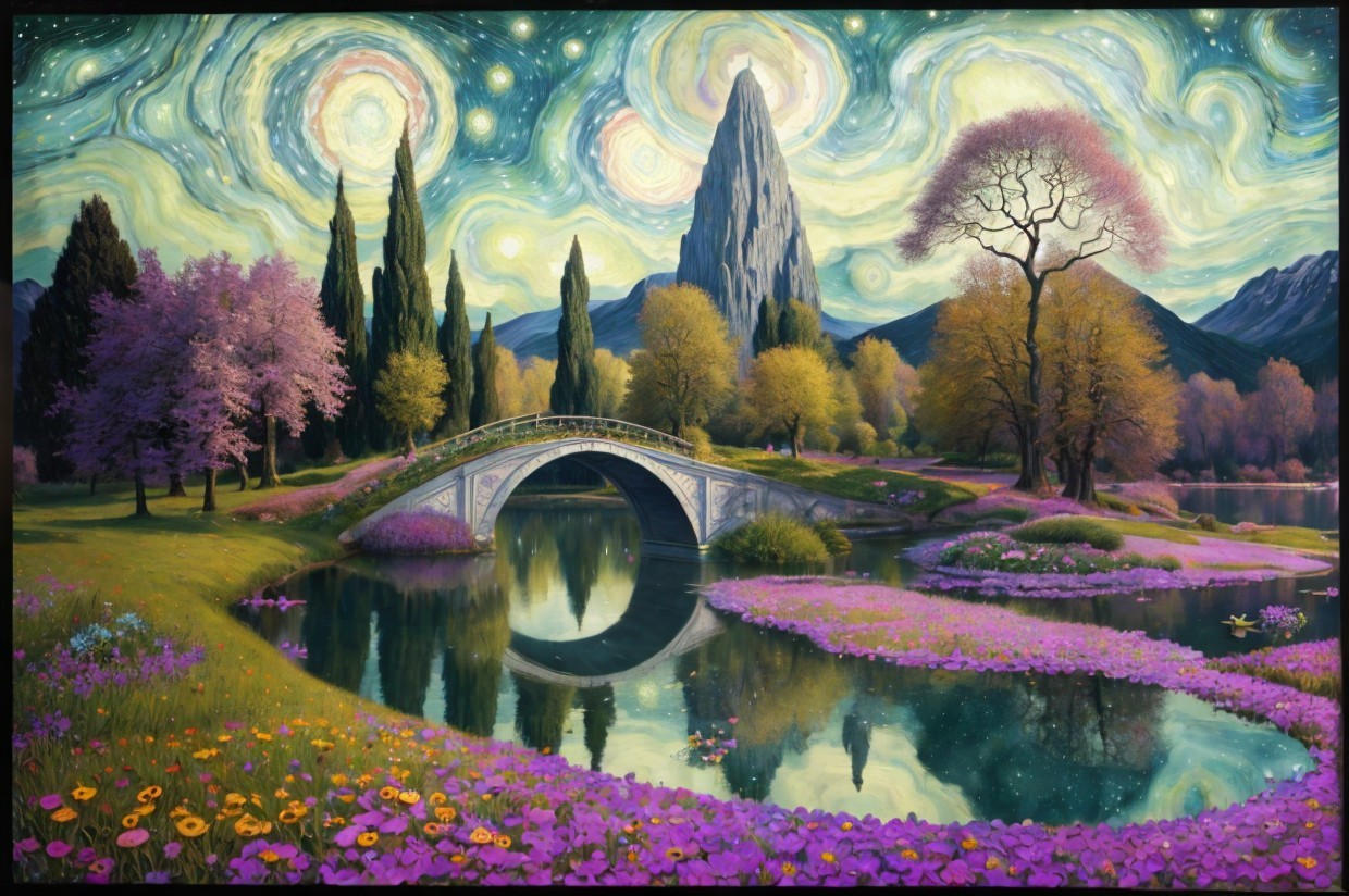 A whimsical landscape painting blending a starry, Van Gogh-inspired sky with a serene, colorful earthly scene featuring a bridge and cherry blossoms.