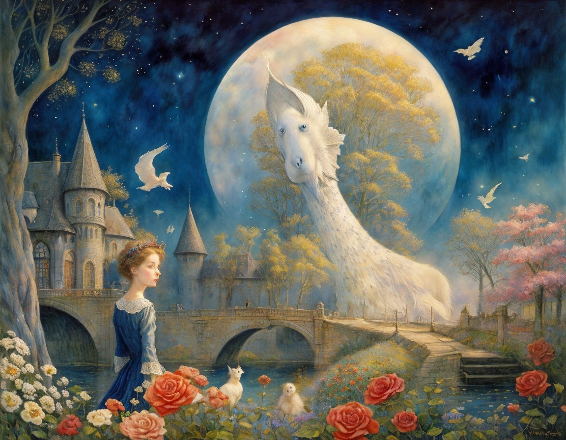 A couple sits on a rock, gazing at a large moonlit sky above a serene landscape featuring a castle, rolling hills, colorful flowers, and a calm sea, creating a dreamy, peaceful atmosphere.