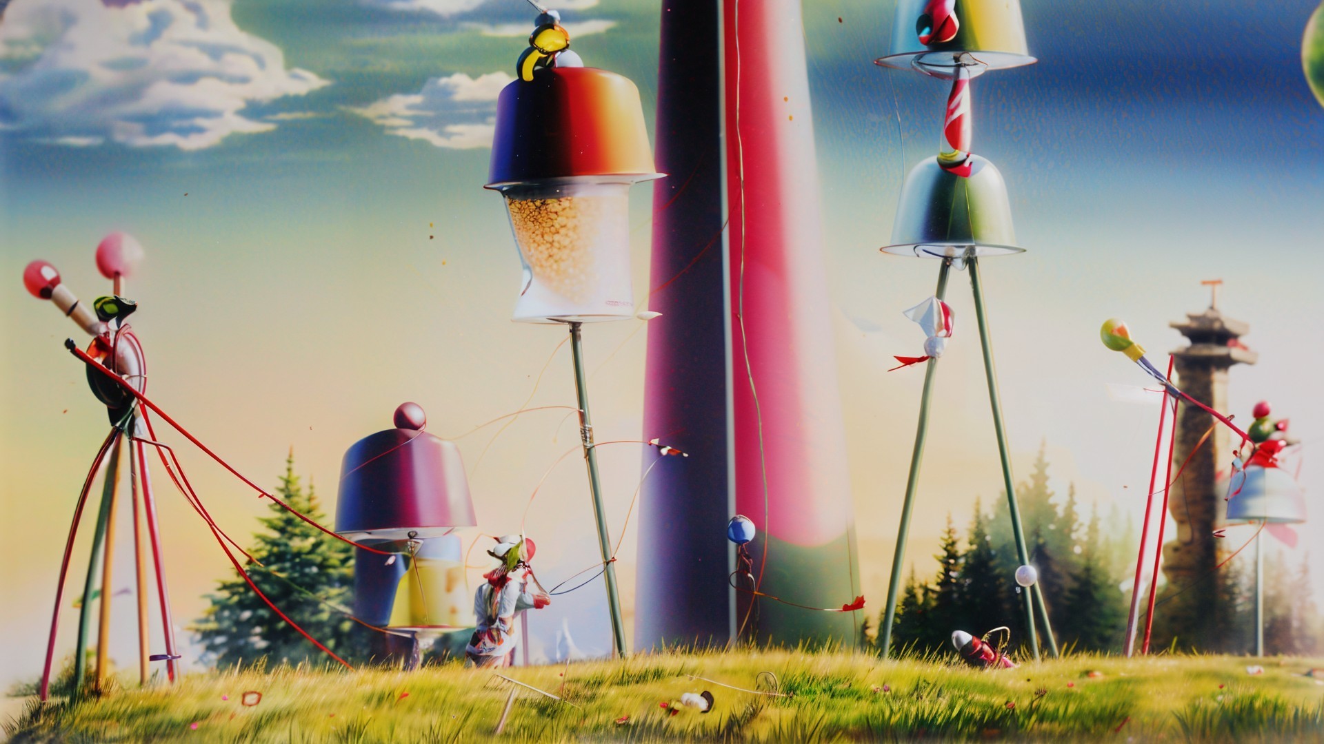 A girl in a colorful skirt stands in a whimsical landscape filled with oversized candy-like structures under a bright blue sky with fluffy clouds, creating a vibrant, fantastical scene.