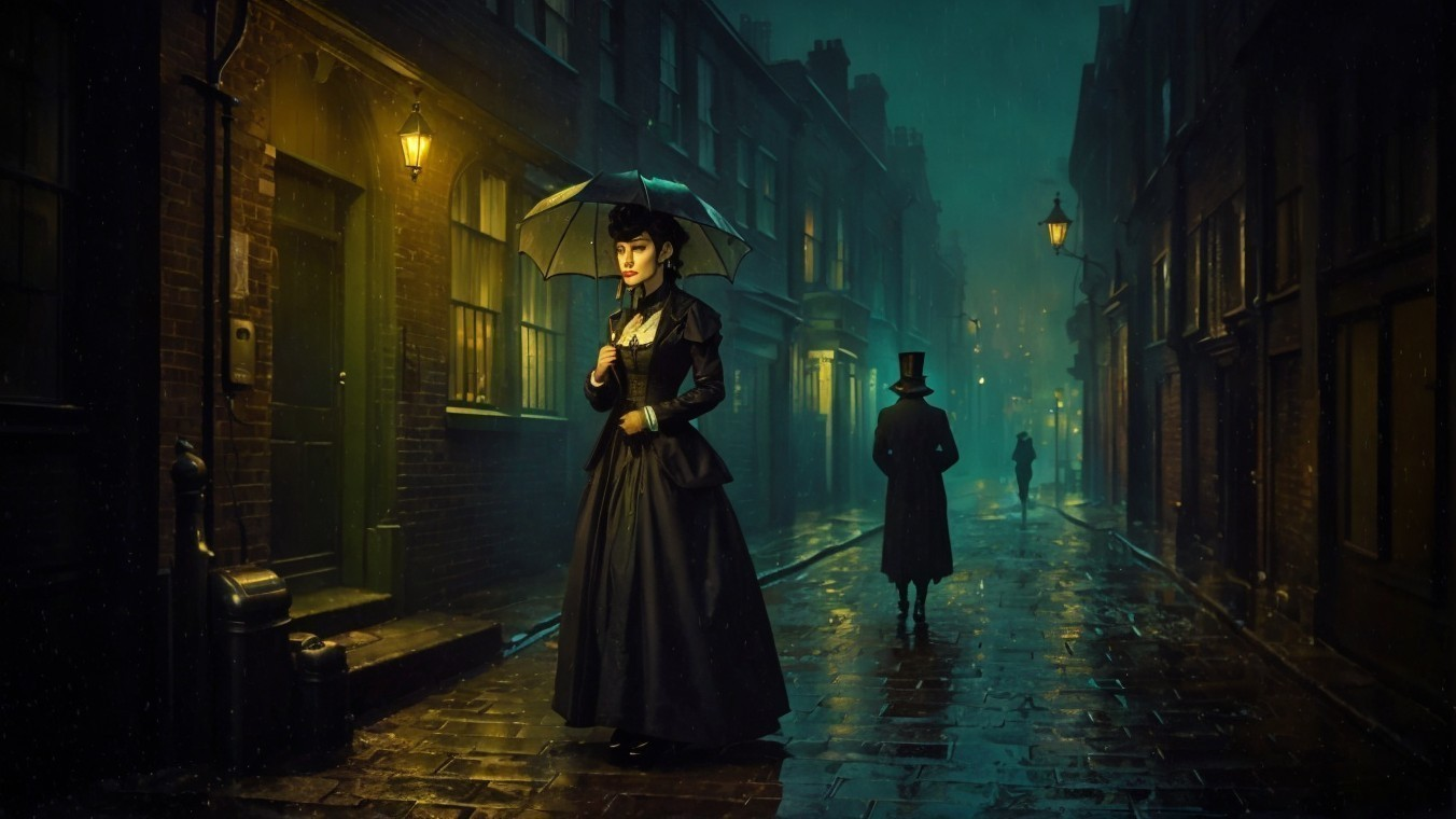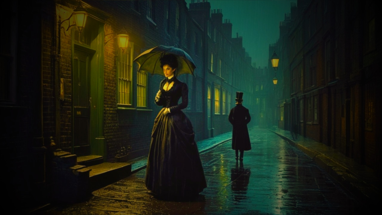 Prompt: "Rainy winter, Victorian London, by gaslight.
