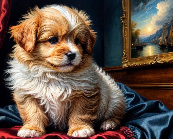 A beautiful fairy with flowing red hair and delicate wings stands in a lush forest. She wears a soft, flowing gown and a floral crown, exuding an enchanting, magical aura.
