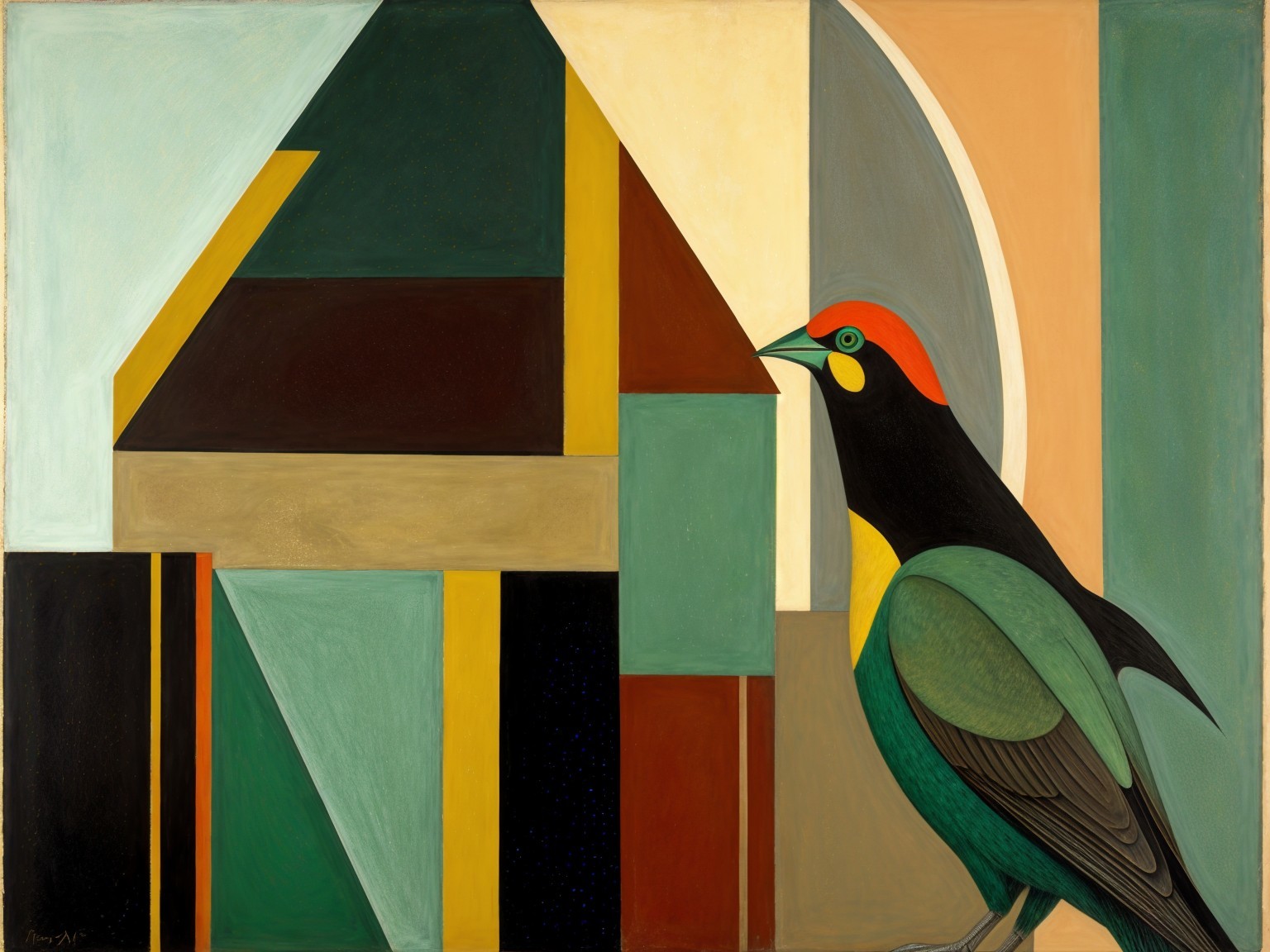 The artwork features a stylized bird, characterized by vibrant colors, against a background of geometric shapes and muted tones, creating a harmonious blend of nature and abstraction.