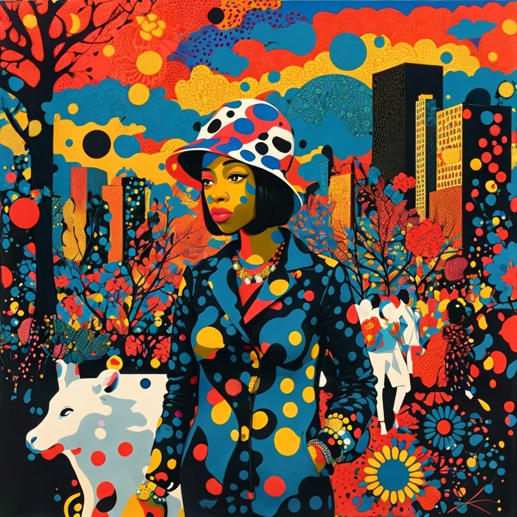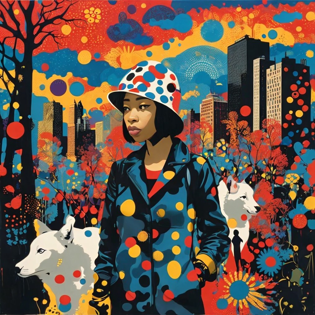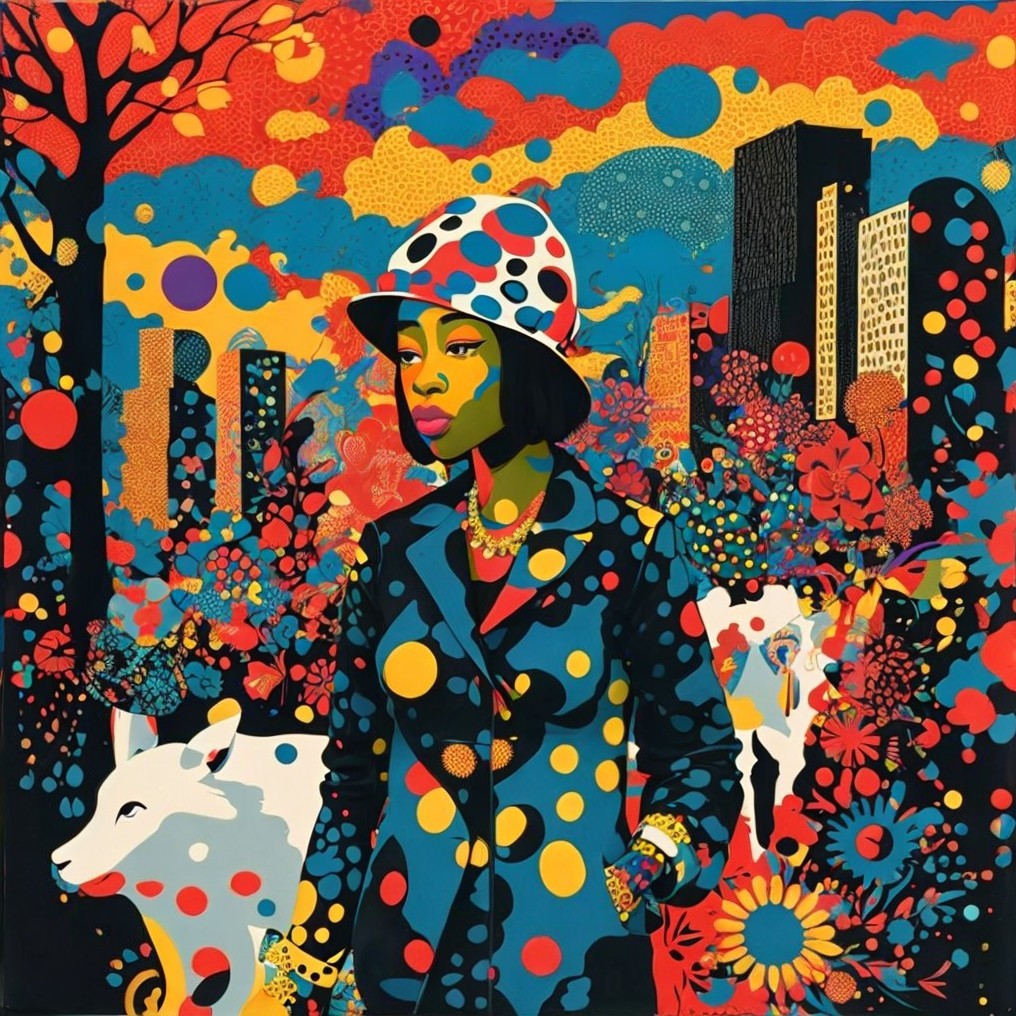 A colorful artistic image featuring a stylized woman with a polka-dot hat, a patterned outfit, and a dog, set against a vibrant abstract cityscape.