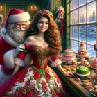A cheerful Santa and a woman in a festive red dress stand by a cozy kitchen window, adorned with holiday decorations. The scene is warm, showcasing winter outside and festive treats inside.