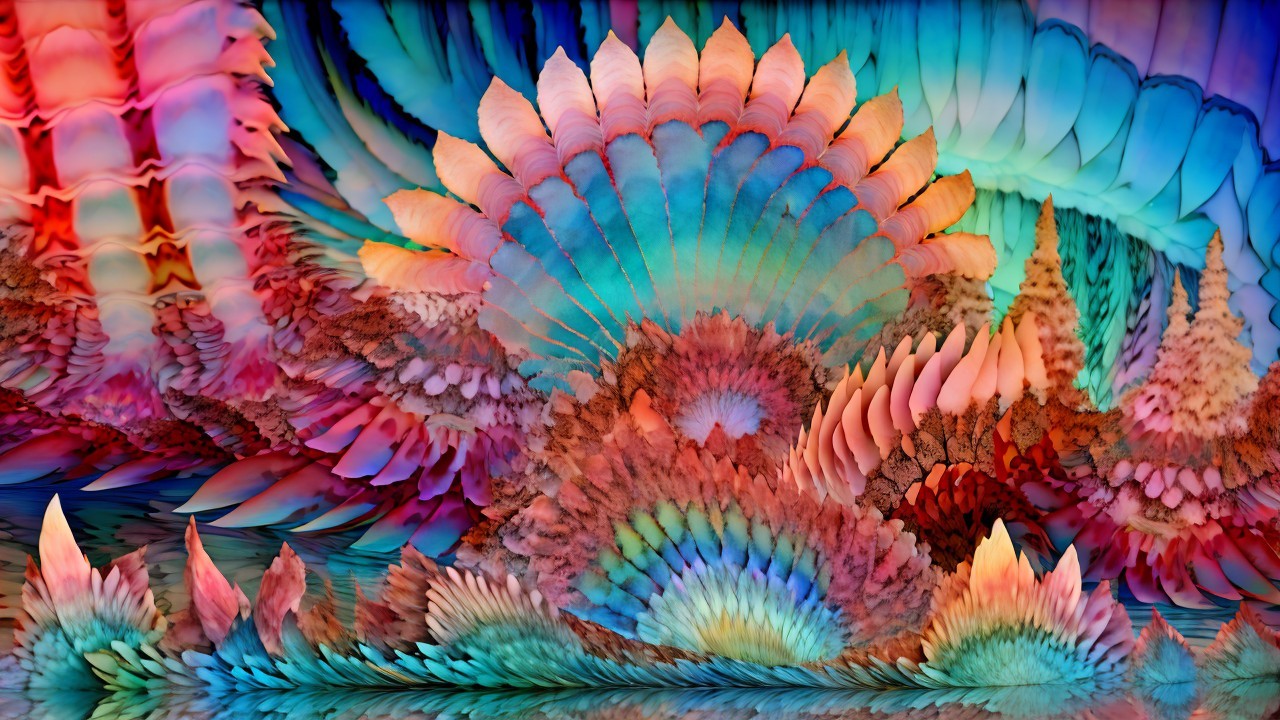 A vibrant abstract composition of swirling, colorful patterns resembling feathers and leaves, with intricate details and a kaleidoscope of hues blending harmoniously across the canvas.