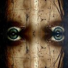 The image features a striking portrait of a woman, split in half with a cracked surface, revealing deep emotional intensity in her blue eyes, contrasting vulnerability and strength.