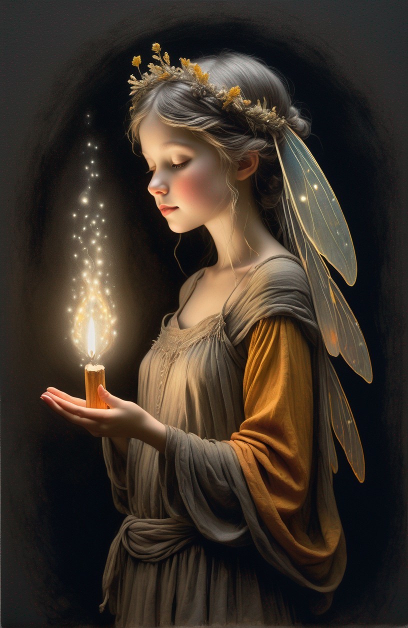 A serene girl with delicate fairy wings gazes at a candle's flame amidst a magical glow of floating lights.