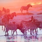 A group of horses wades through water during sunset, silhouetted against a vibrant orange sky. Soft hills and a tree complete the serene, picturesque landscape.