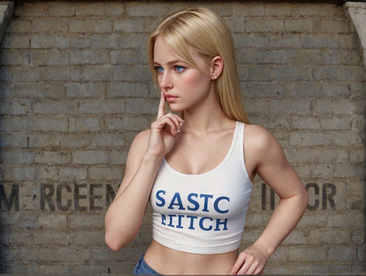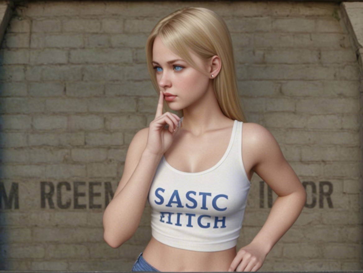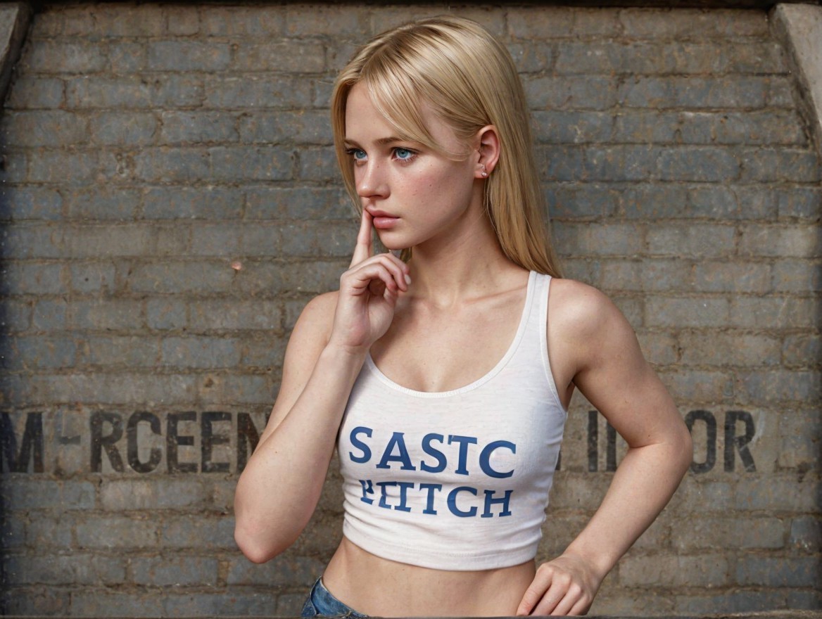 A young woman in a white crop top with blue text stands thoughtfully, her finger resting on her chin. She has long blonde hair and a contemplative expression against a textured wall.