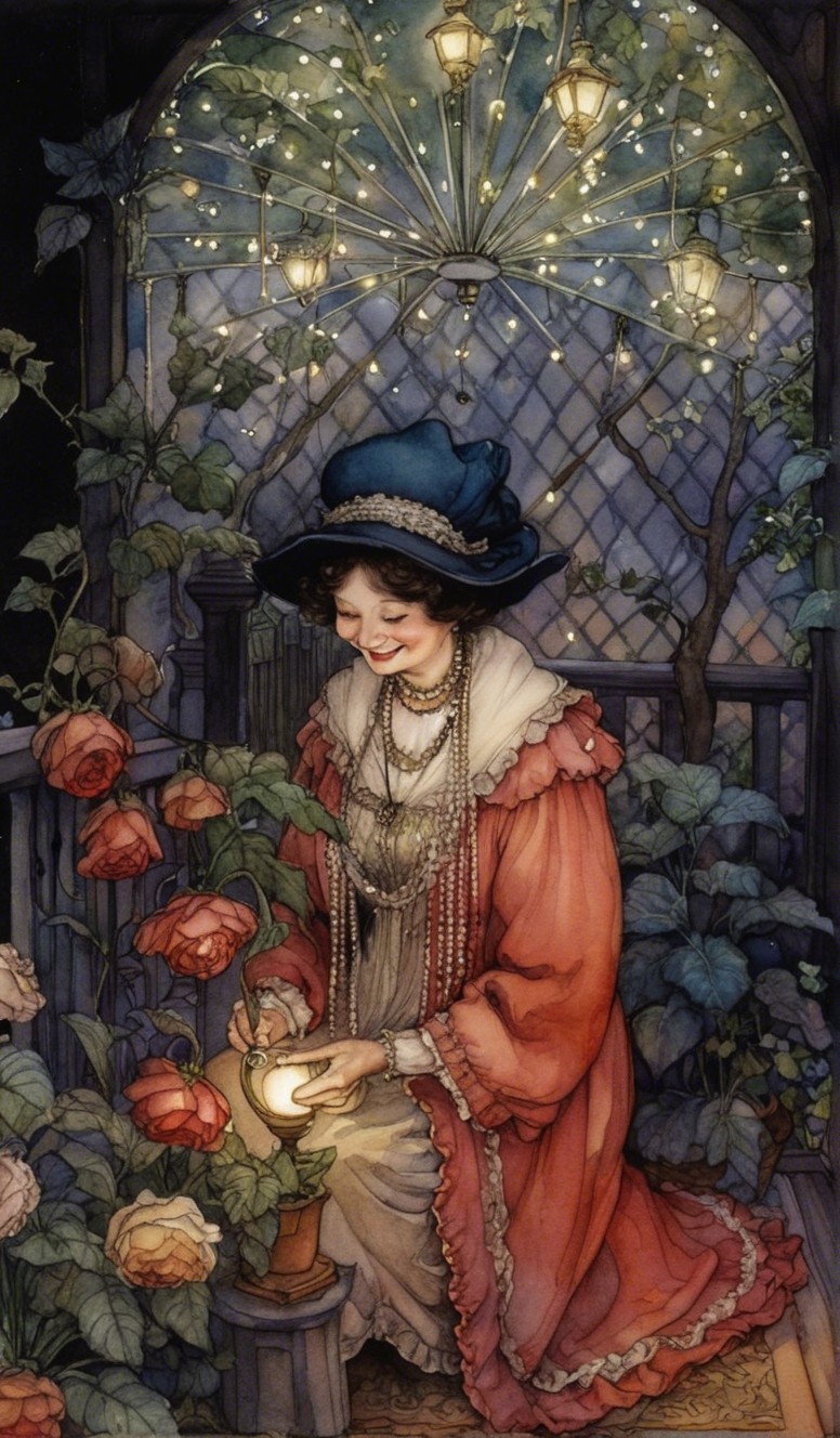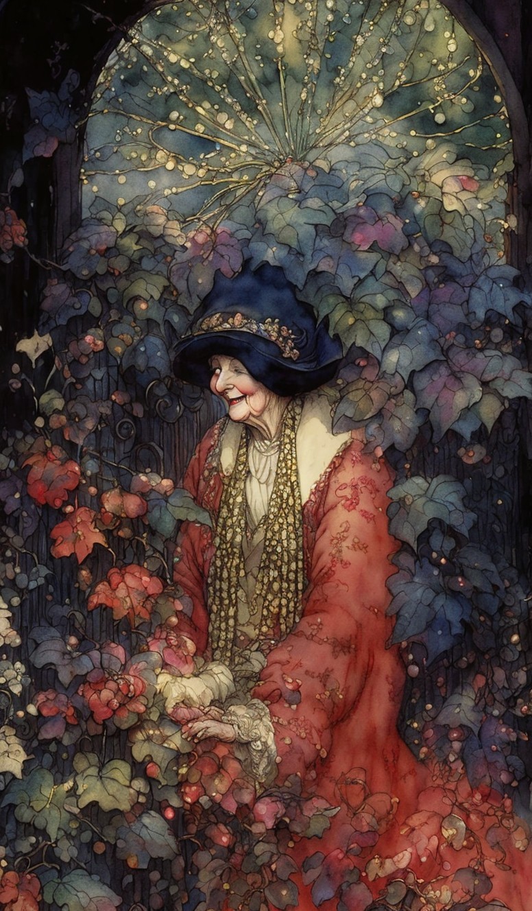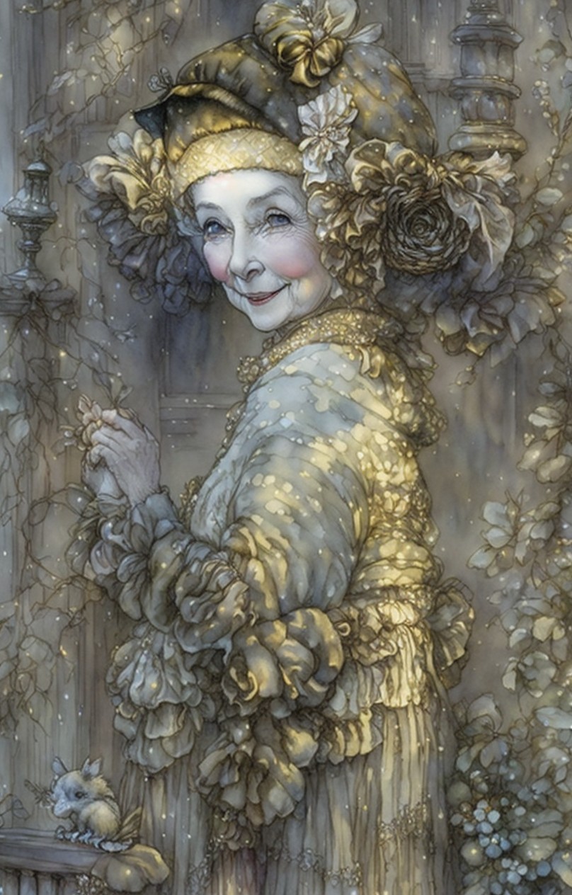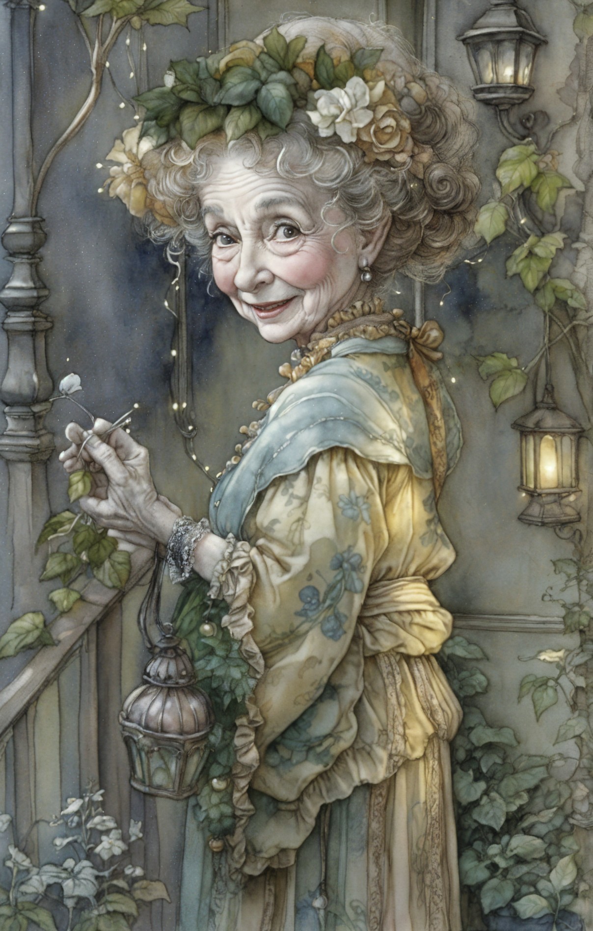 An elderly woman in a pastel dress and large hat stands on a porch, smiling warmly. She holds a knitting needle, with a tiny dog beside her and soft lights twinkling in the evening ambiance.