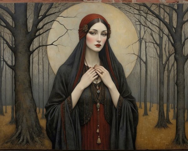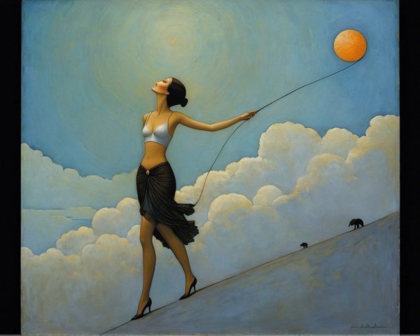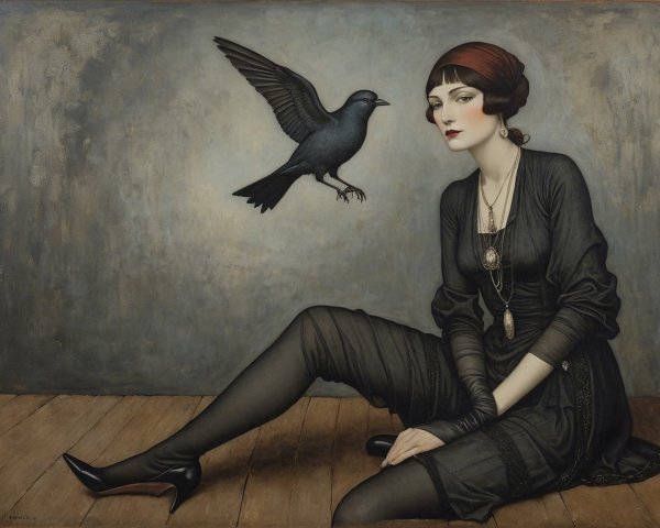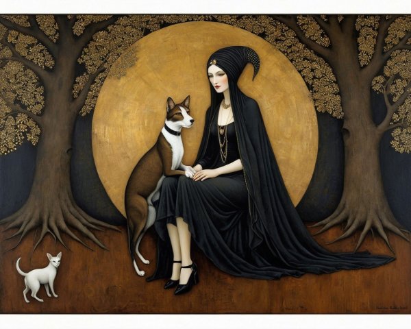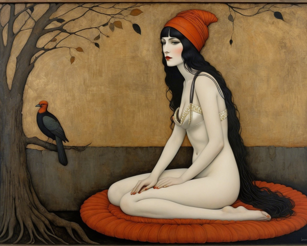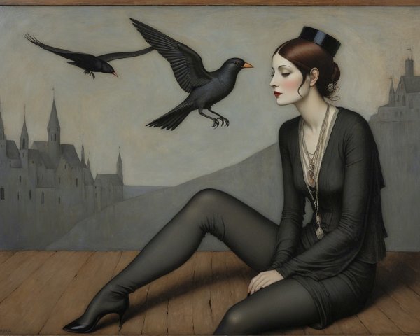 A graceful woman in a vintage outfit sits among whimsical flowers and dandelions, with a majestic tiger looming nearby, all set against a muted, dreamy background with soft tones.