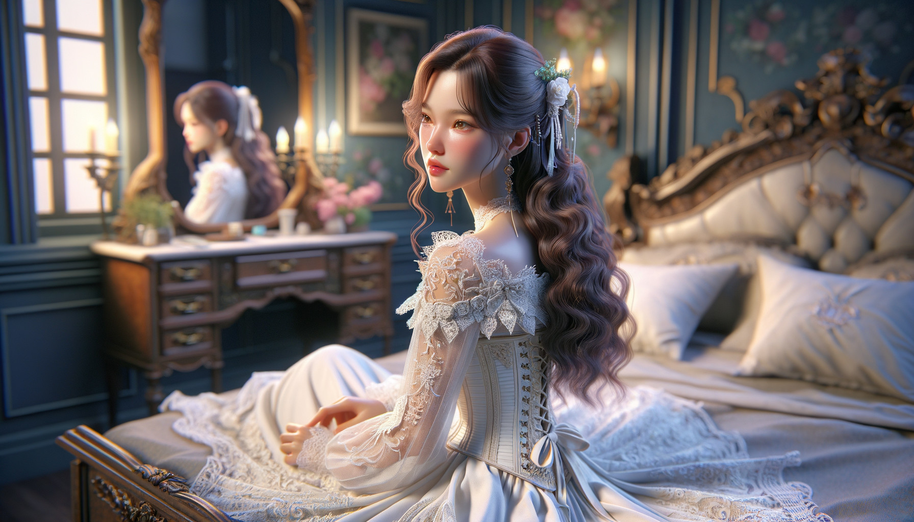 A woman in an elegant white dress sitting on a bed in a luxurious room, with her reflection visible in a mirror.