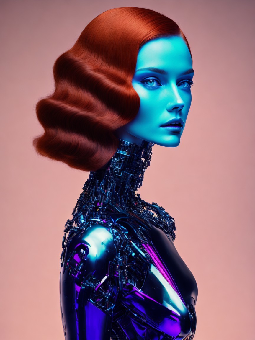 A futuristic robotic figure with sleek, metallic features and vibrant blue skin, accentuated by wavy, glossy red hair, stands against a soft pastel background, blending technology and beauty.