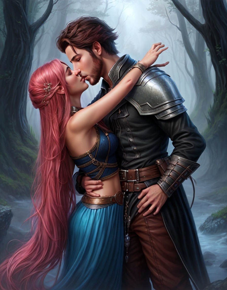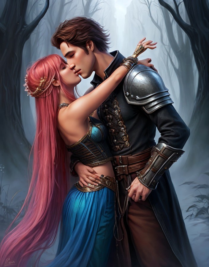 Medieval man kisses red-haired woman in mystical forest