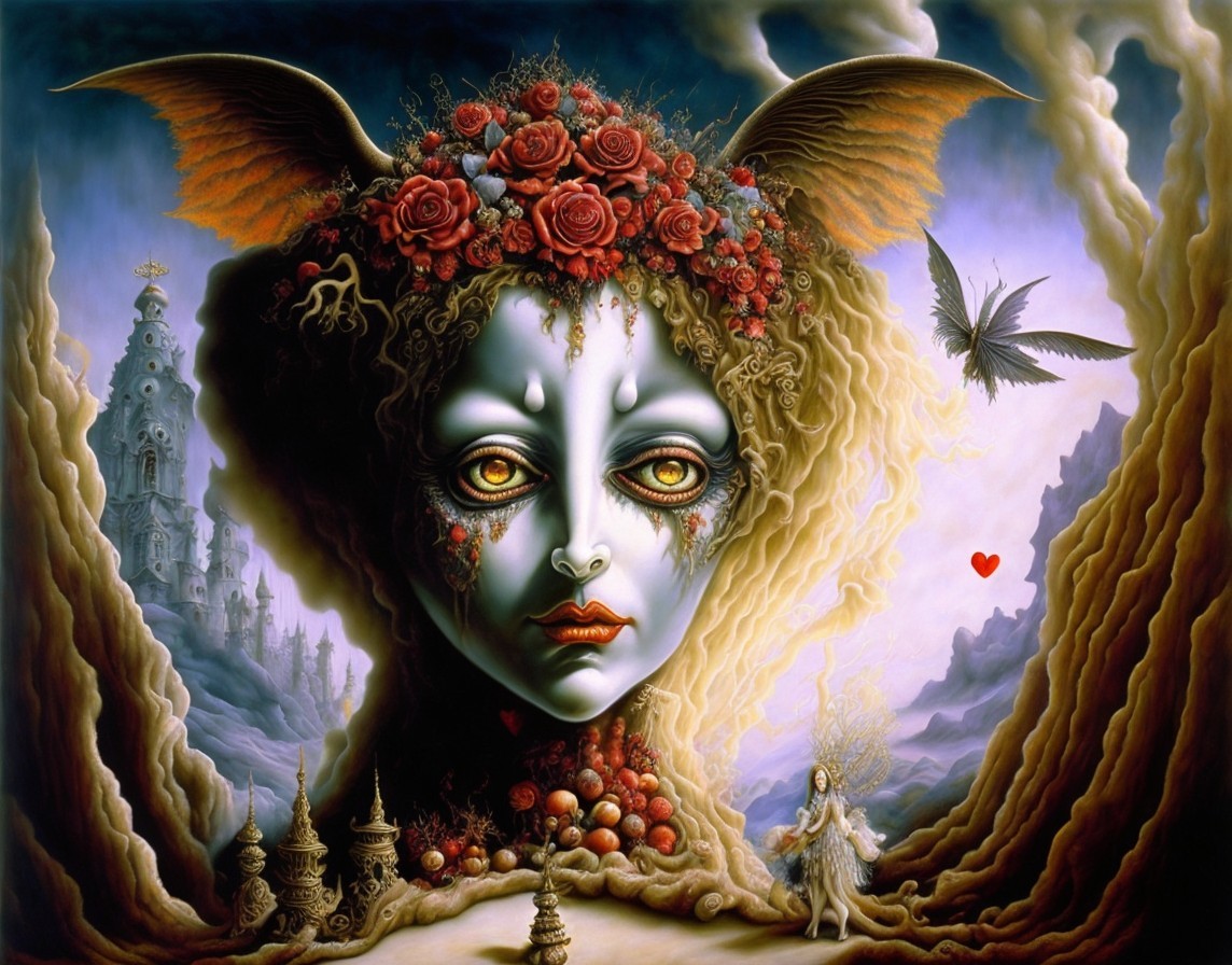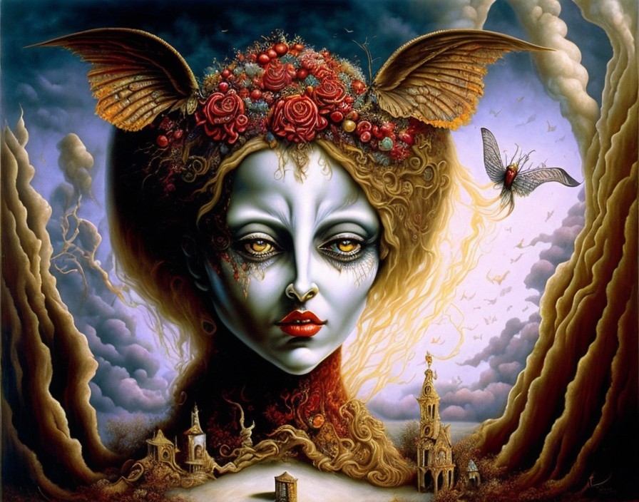 A surreal portrait with a female face, floral crown, two cats, ornate towers, and butterflies, all in a dreamlike, ominous atmosphere.