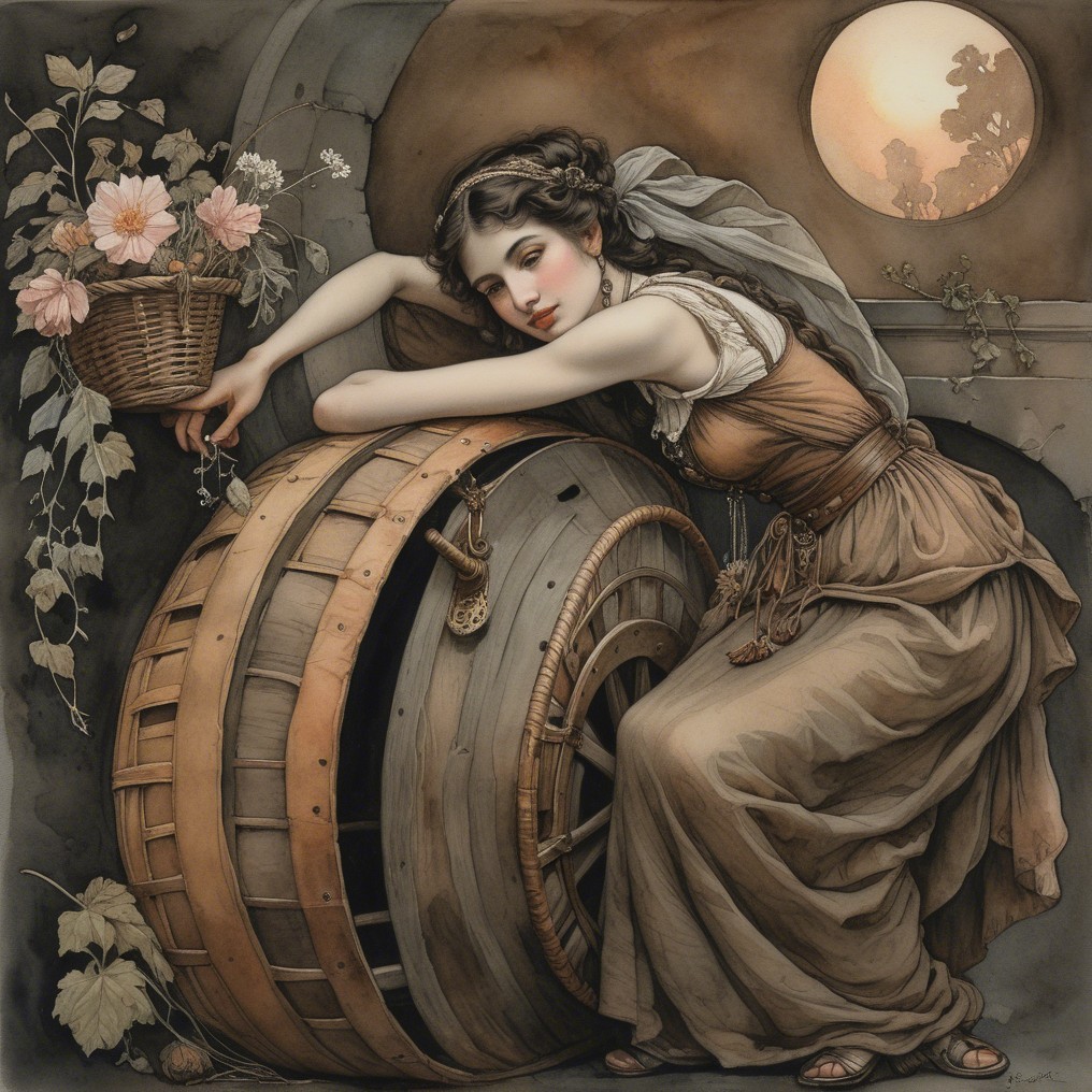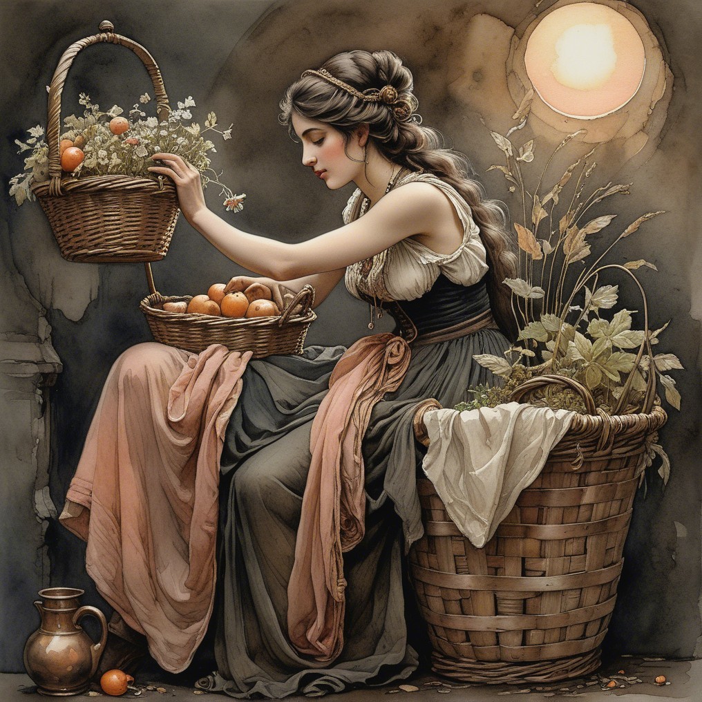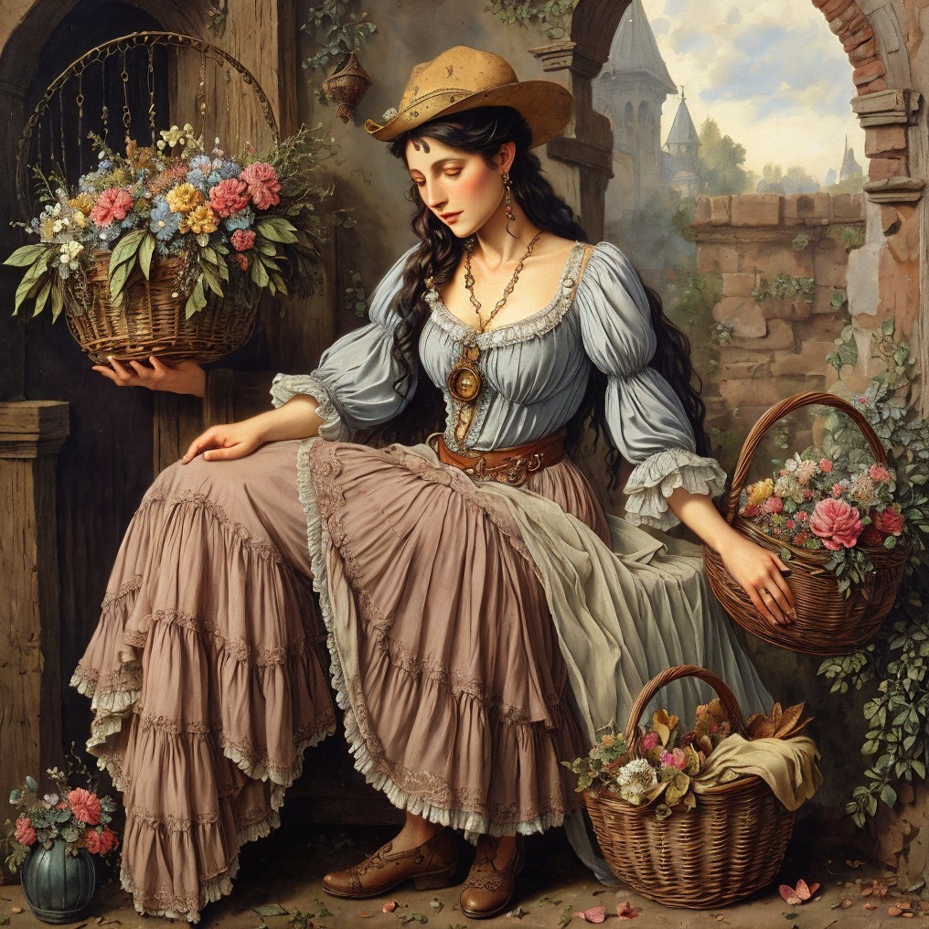 A young woman in a historical dress sits by a stone wall, holding two woven baskets filled with vibrant fruits and flowers, embodying a classic, rustic charm.