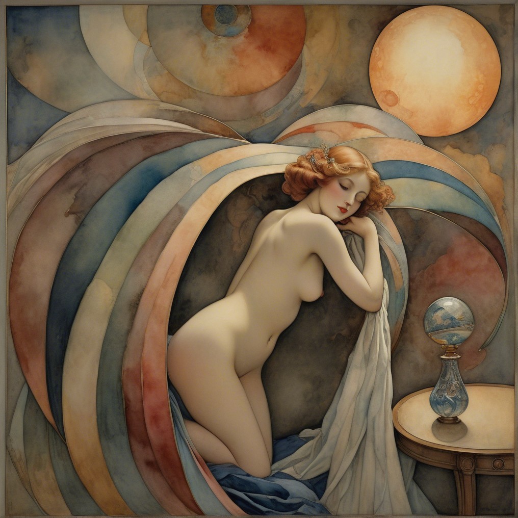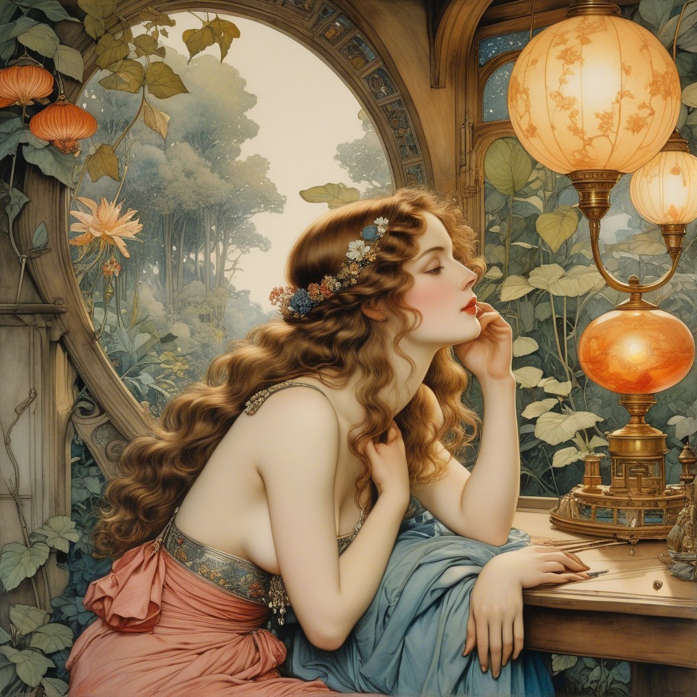 A serene, ethereal woman sits gracefully on a table, draped in flowing fabric. She gazes out at a lush landscape through an ornate window, illuminated by warm, glowing lanterns.