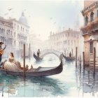Venetian scene depicts a gondola gliding through tranquil waters, with ornate buildings reflecting the soft light, while a couple enjoys a romantic moment amidst the picturesque backdrop.