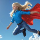 A young girl with long blonde hair wears a red cape and blue shirt, joyfully flying against a blue sky with fluffy clouds, embodying the spirit of a superhero.