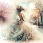 A beautiful woman with long, flowing blue-grey hair adorned with delicate pink flowers sits elegantly, her eyes closed and a serene expression on her face. She is wearing a soft peach-colored dress with intricate lace detailing on the bodice and full, flowing sleeves. The sleeves are embroidered with light pink and