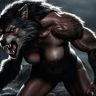 A muscular, humanoid wolf creature stands fiercely, showcasing bulging muscles and a fierce expression. Its fur is thick and wild, set against a dramatic, stormy backdrop.