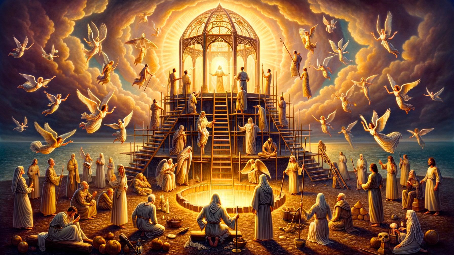 Prompt: Una escena de almas humanas construyendo un templo espiritual, bajo las bendiciones eternas del Espíritu de Dios que consolida el Reino de paz.