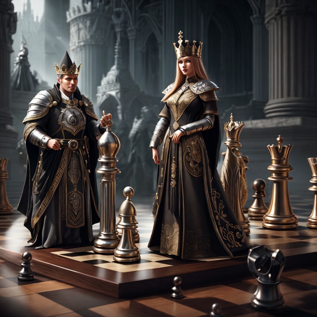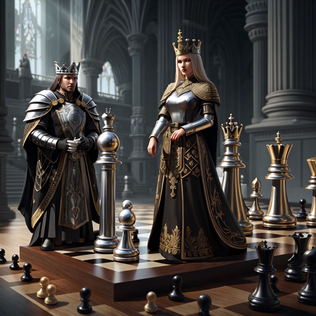 A king and queen stand on a giant chessboard, surrounded by oversized chess pieces, in a grand, sunlit hall.