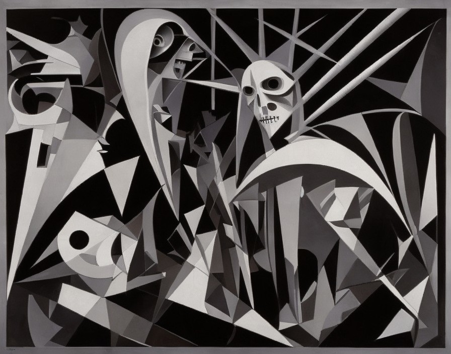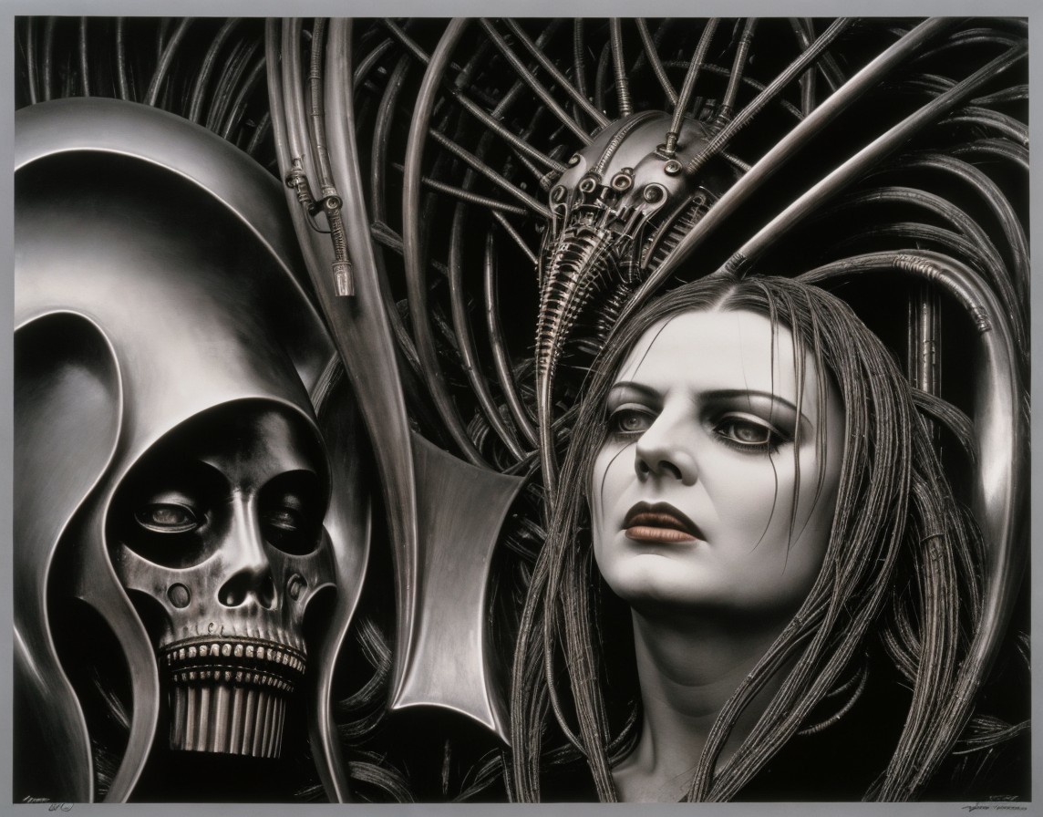 Monochromatic artwork featuring a human skull juxtaposed with a woman's face and intricate mechanical elements in the background.