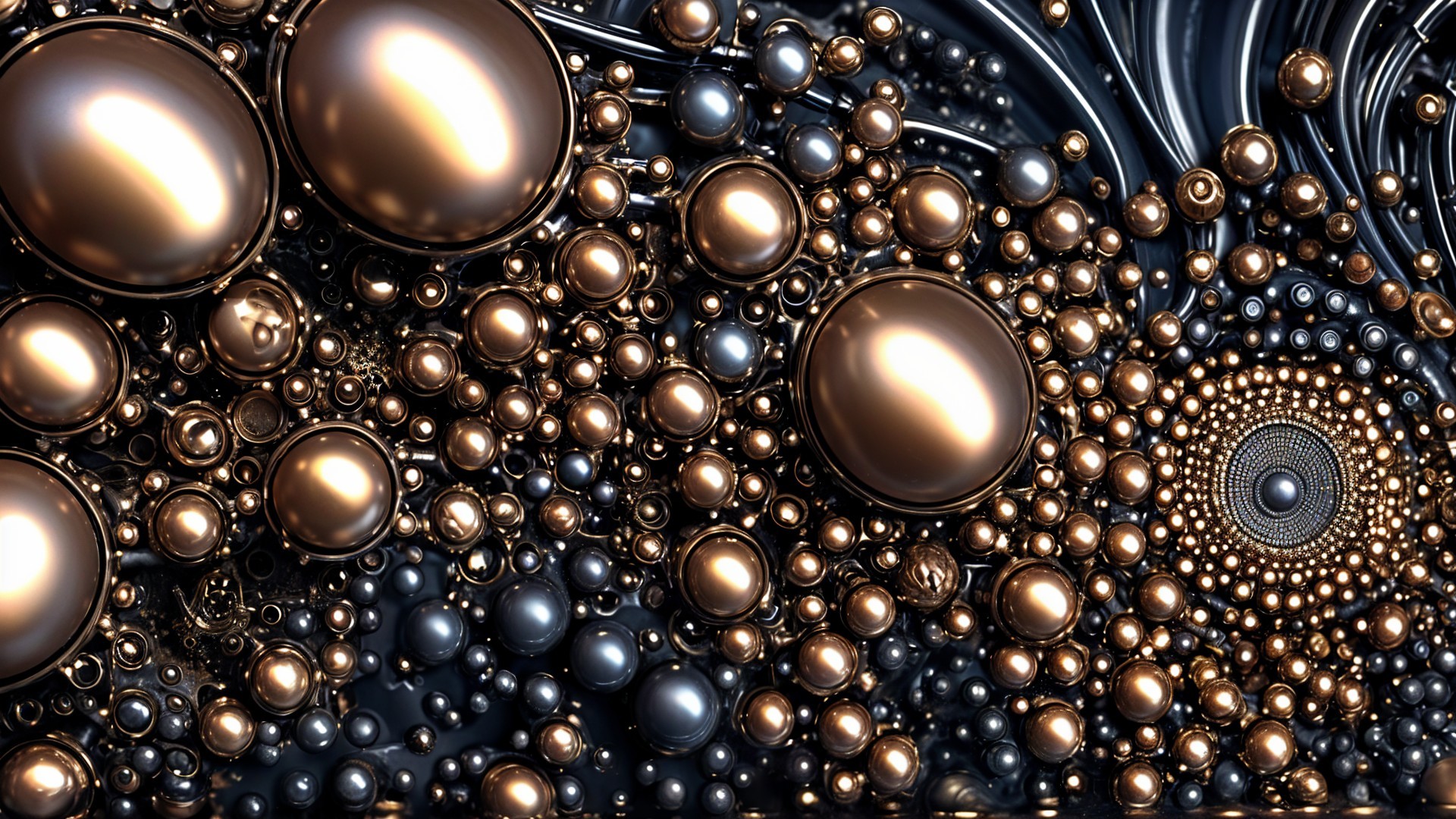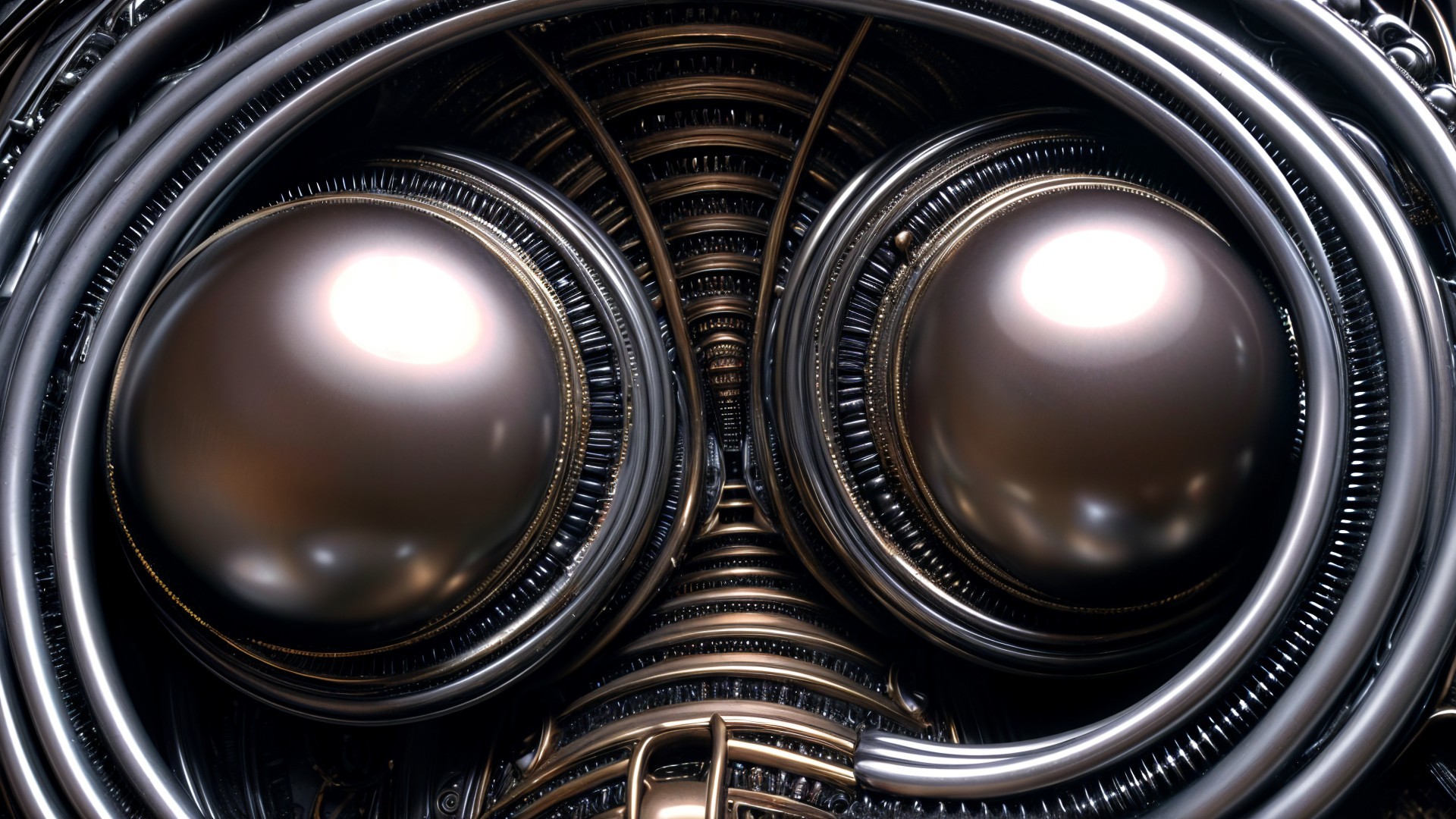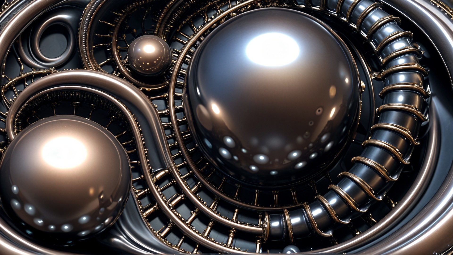 The image features a complex, industrial design with intricate metallic tubes spiraling around two large, shiny spheres, creating a steampunk or cybernetic aesthetic.