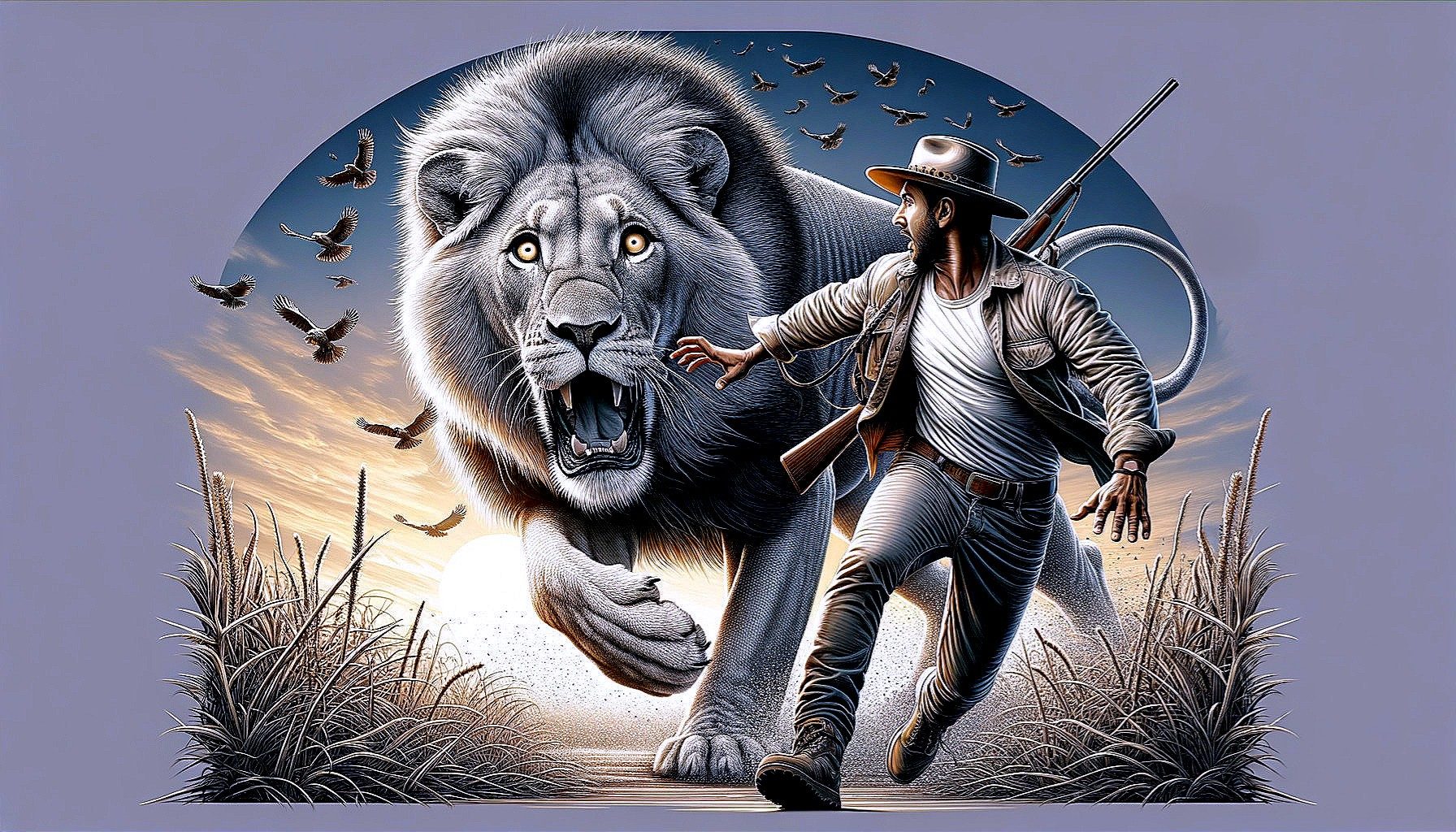 A man in a hat and coat strides forward with a gun, while a large lion roars beside him against a backdrop of birds in flight.